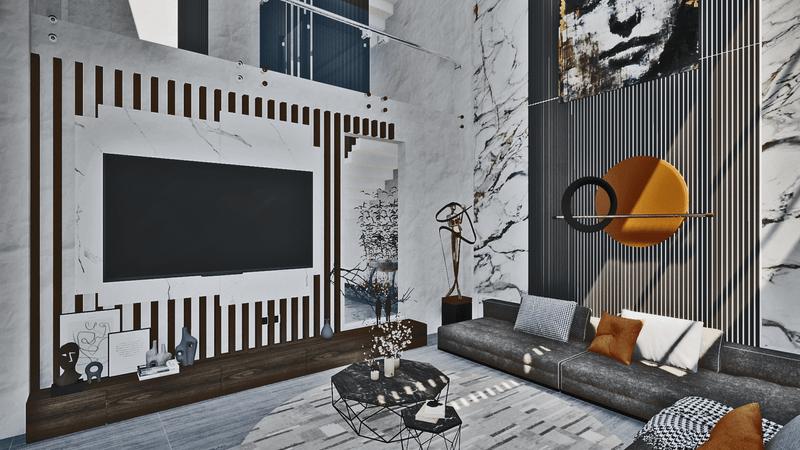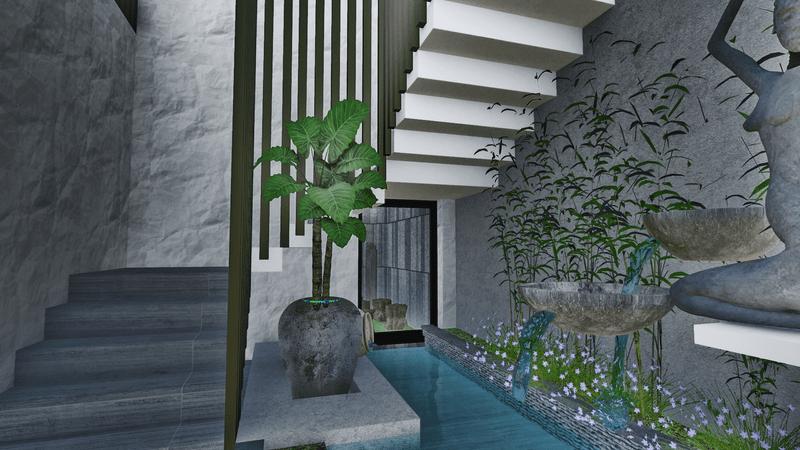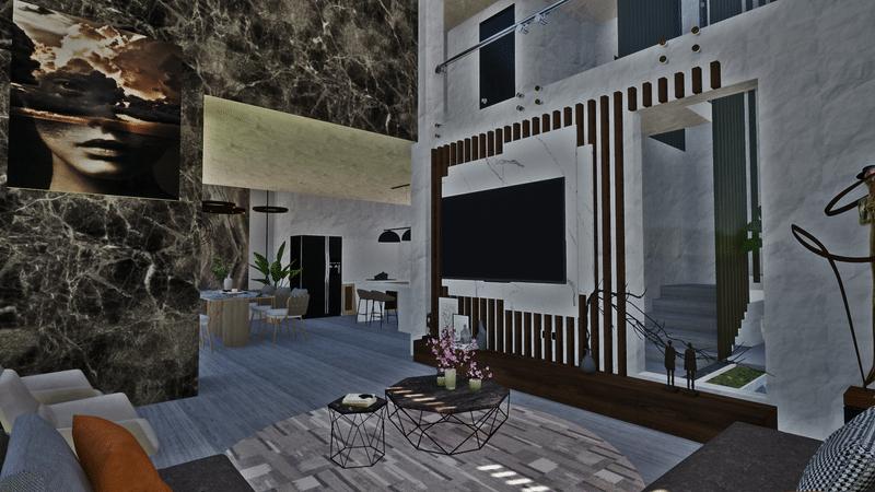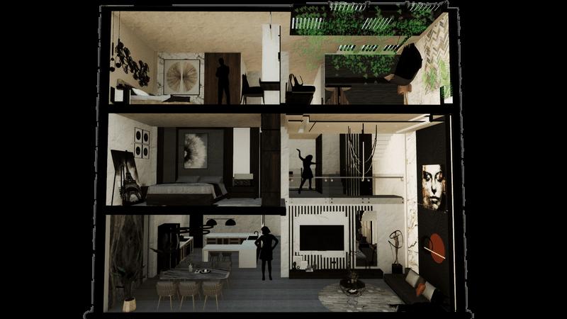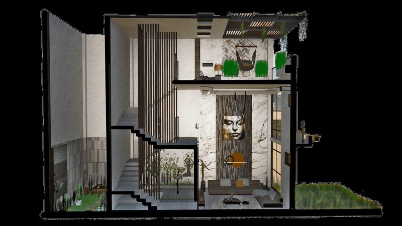 Por ello se planteó una distribución espacial de las zonas en donde se puede lograr visualizar ambientes con doble y triples alturas, llevando a proporcionar una espacialidad monumental con diversas visuales y panoramas hacia los espacios verdes generados en base a la sostenibilidad y sustentabilidad que la vivienda refleja. De tal manera que logra brindar espacios equilibrados entre las zonas sociales y privadas de la misma manera se enmarca con un porcentaje considerable al área libre.