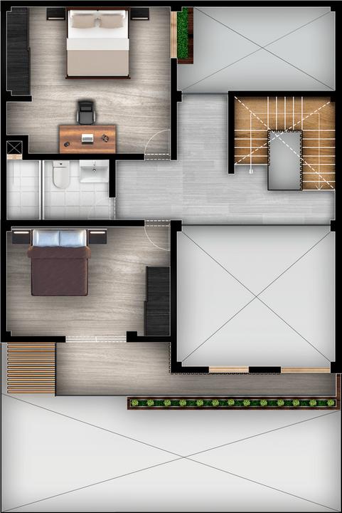 En el segundo nivel de la vivienda esta determinada por 2 zonas, en el cual se encuentra la zona privada y servicio, en conexión por un eje articulador horizontal que brinda la facilidad de accesibilidad a los ambientes, asimismo logra generar visuales hacia la zona de doble altura (sala) y triples alturas (Jardín y la zona de la circulación vertical), de tal manera que está conformado por un baño céntrico que brinda el servicio a los dos dormitorios, donde cada uno de ellas cuenta con una amplia ventana y mampara, llegando ello a recibir una ventilación e iluminación natural y lograr que el ambiente y el usuario se encuentre de cierta manera en confort, asimismo se logra brindar una visualización espacial al exterior e interior por medio de los balcones verdes proporcionados en la vivienda