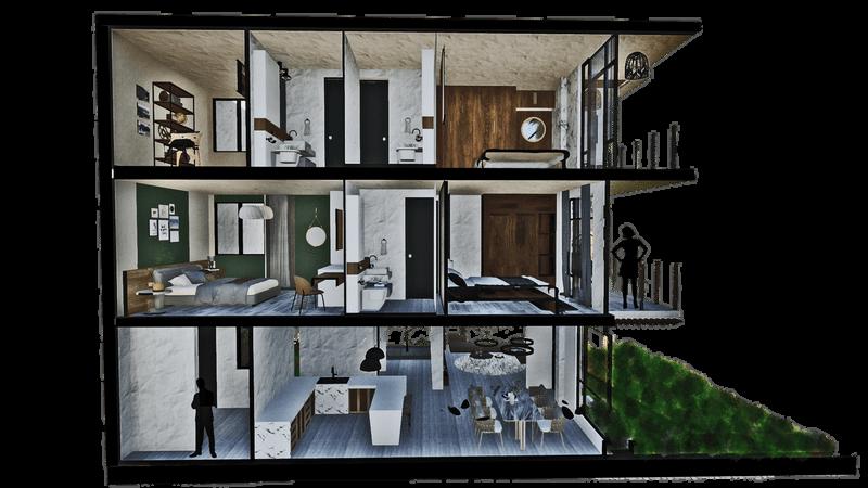 En esta vista frontal se ve reflejada como se genera esa armonía conceptual que abarca la sostenibilidad, espacialidad y materialidad. Llevando ello a obtener una fachada imprescindible y ecológica en donde se visualiza a simple vista amplios ventanales y mamparas, logrando que volumen no trasmita solidez ni se vea pesado. asimismo gracias a los bambús se pueden generar ese juego de sombras en el interior de los ambientes de tal manera que el color blanco haga la función de efecto rebote. Por último se llega captar los amplios balcones y terrazas verdes.