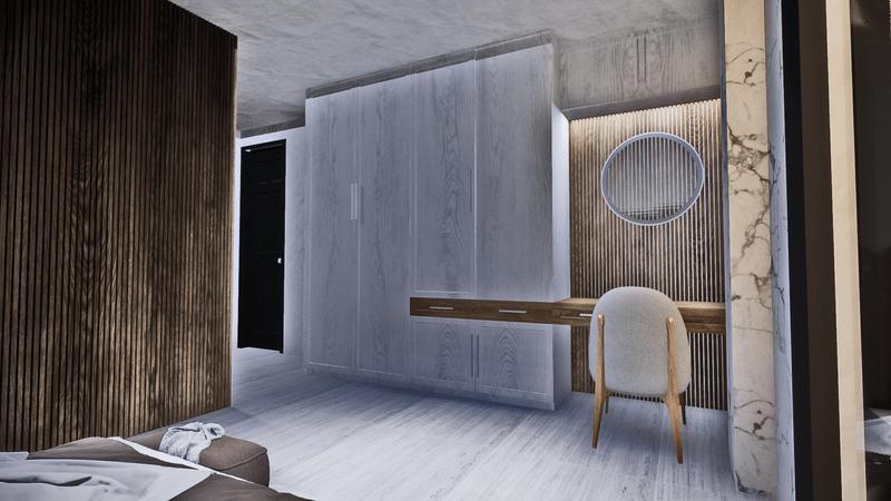 El primer dormitorio es para el Hijo mayor, esta presenta una mayor área y cuenta con la vista principal hacia el parque zonal, y el eje central ya que cuenta con un balcón que permite recorrer y visualizar la sala de doble altura además esto genera una mayor iluminación y ventilación en el dormitorio.