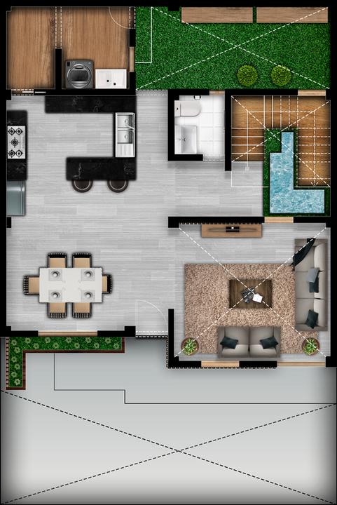 En la distribución del primer nivel al ingresar a la vivienda tenemos una sala que presenta una doble altura la cual tiene una visión hacia el área verde que se encuentra debajo de las escaleras, de igual manera se puede acceder fácilmente al comedor y cocina que también se logran ventilar e iluminar por el área libre que se presenta en las escaleras, posteriormente tenemos el área de almacén de limpieza y un área de lavado en donde se podrá secar la ropa en el jardín. Principalmente de la vivienda se puede destacar su buena ventilación, iluminación, espacios y ambientes abiertos en la cual se generan recorridos con fácil acceso con el área verde tanto vertical como horizontalmente, áreas libres que se vienen trabajando desde la conceptualización, además teniendo en cuenta el Reglamento Nacional de Edificaciones (RNE), generamos un retiro en la vivienda, y consideró un 30% de área libre .