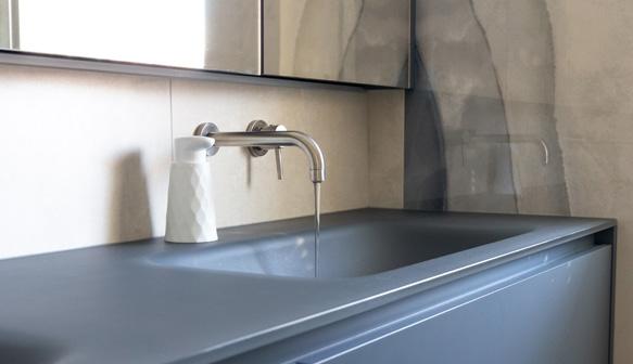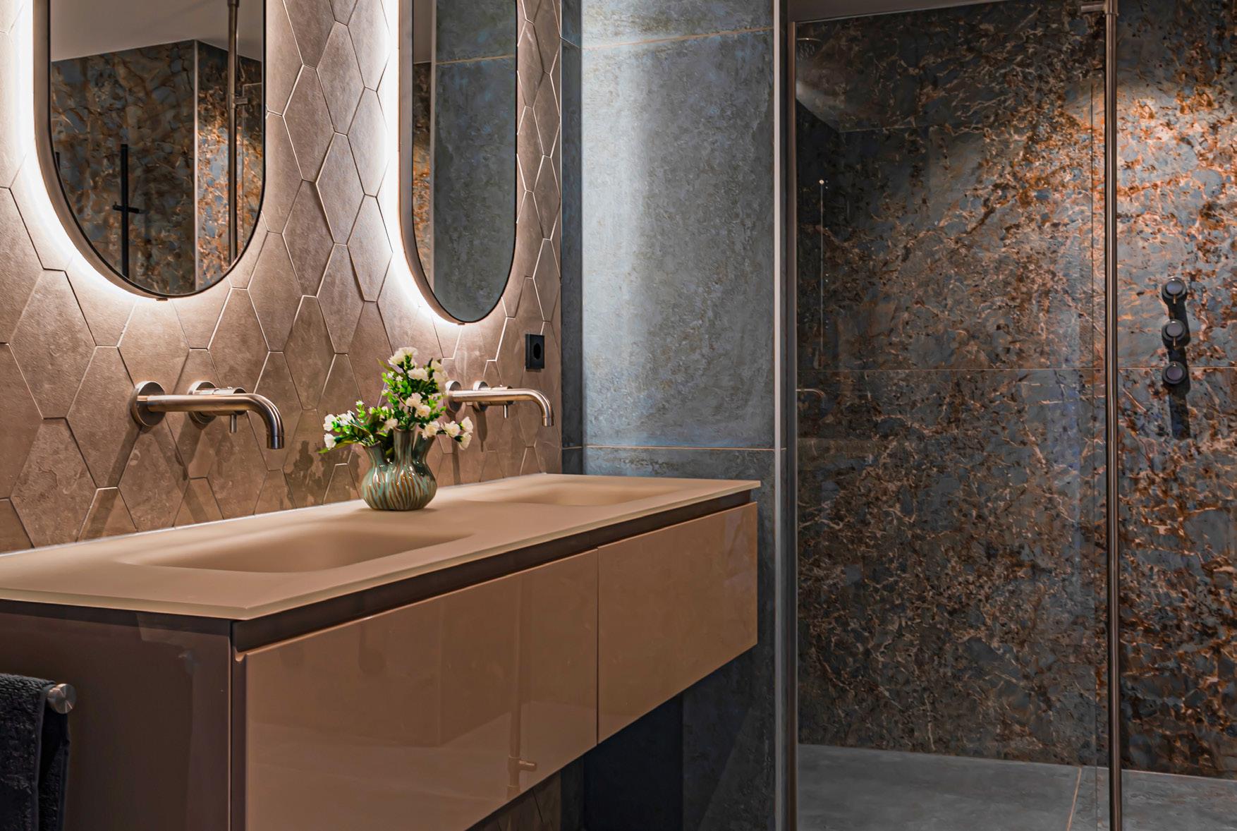 Om de badkamer van een unieke uitstraling te voorzien, is het de kunst van verschillende tegels en tegel patronen met elkaar durven te combineren. Met grote tegels kun je de ruimte bijvoorbeeld optisch groter maken en met kleinere, unieke vormen breng je extra sfeer. De kracht van deze badkamer zit hem vooral in de tegels en de kleuren, maar ook het uitgetekende lijnenspel, wat wellicht op het eerste oog niet opvalt maar wat je in de bouwtekeningen goed terugziet. De marmerlook tegels van 120 bij 120 zetten de toon én laten alle kleuren en materialen van de badkamer helemaal samensmelten tot een mooi geheel. Naast een luxe inloopdouche is deze badkamer ook voorzien van een prachtig ingebouwd ligbad om lekker te ontspannen. Doordat de blauwe wand- en vloertegels doorlopen op het bad, ontstaat er een mooi en rustig geheel. De strak weggewerkte inbouwkranen en handdouche liggen perfect op één lijn doordat ze gemonteerd zijn met een zogeheten installatiebrug. Zo’n brug zorgt ervoor dat alle onderdelen tegelijk en op exact dezelfde hoogte en diepte kunnen worden ingebouwd.