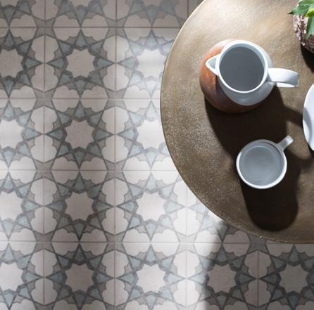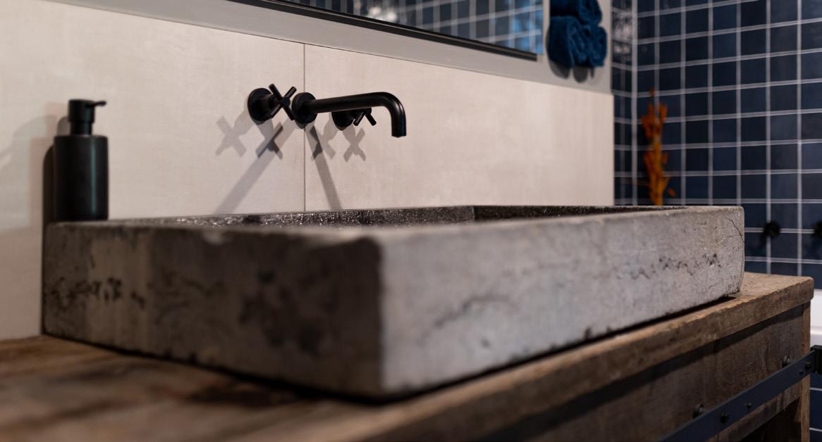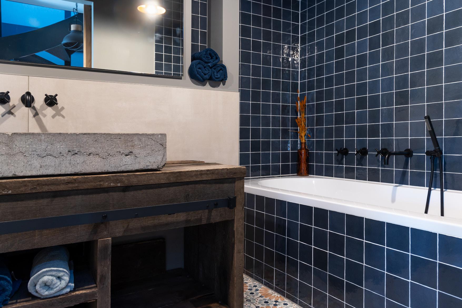 Deze luxe badkamer is voorzien van drie verschillende soorten tegels: grote grijze tegels, donkerblauwe vierkante tegels en Portugese patroontegels. Elke tegel heeft zijn eigen unieke uitstraling: rustiek en neutraal of gezellig. Het vintage houten badkamermeubel en de robuuste wasbak van natuursteen, zorgen voor een warme sfeer. Er is gekozen voor moderne inbouw kruisgreep kranen en een handdouche in matzwart en het ligbad is mooi weggewerkt met donkerblauwe badkamertegels van 10 x 10 cm. Door inbouwnisjes is meer ruimte gecreëerd, wat erg handig is om de badkamer netjes en schoon te houden.