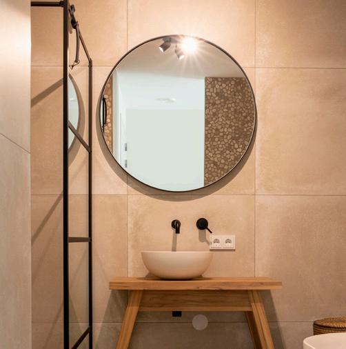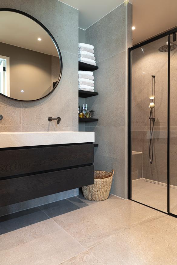 Deze badkamer ademt een luxe en rustieke sfeer dankzij de combi van neutrale kleuren en tijdloze materialen. Voor de wand en vloer is gekozen voor taupe betonlook tegels van 100 x 100 cm, die het fundament vormen van de badkamer. De strook verticale wandtegels van 6 x 24 cm in de kleur ‘Neutral’ achter het vrijstaande bad zorgen voor een leuke speelse toevoeging. De douche is uitgerust met een thermostaatkraan met omstel en een douchescherm met matzwart frame en inbouwnisjes, waardoor functionaliteit en luxe heel mooi samenkomt. De finishing touch zit hem in de ronde zwarte spiegel, opgehangen in een verzonken frame en voorzien van een touch-dimmer en automatische verwarming. Alle accessoires zijn in de kleur ‘gun metal’ zorgen voor nog meer gevoel van luxe.
