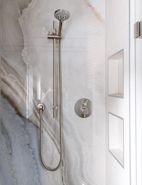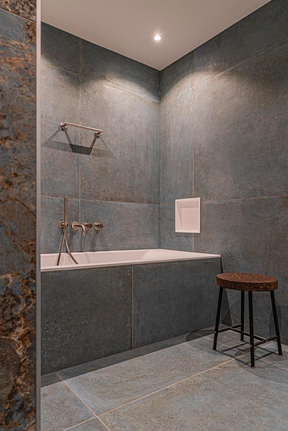 Natuurlijke tinten, grote tegels en strak maatwerk. Luc van den Berg realiseerde deze stijlvolle badkamer met groot formaat slabs tegels van 120 bij 270 in marmerlook. Doordat het aantal voegen tot een minimum wordt beperkt, ontstaat er een mooi geheel en krijg je het gevoel dat je tegen echt marmer aankijkt. Slabs tegels zijn een echte eye-catcher in deze badkamer en zijn geschikt voor zowel de vloer als de wand. De natuurlijke look is goed te combineren met iedere kleur of stijl.