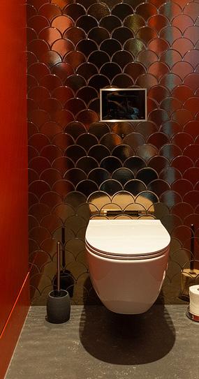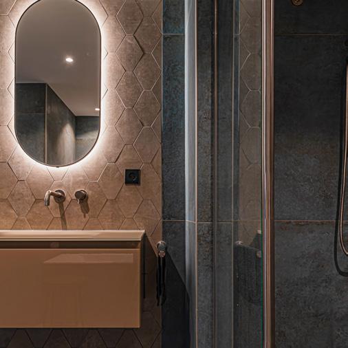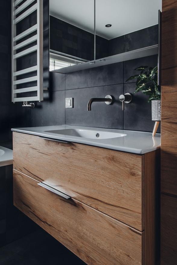 Een donkere badkamer, je moet het maar durven! Deze badkamer is bijna helemaal antraciet en straalt enorm veel karakter uit. De grote tegels in de kleur Icon Black van 60 cm bij 60 cm zijn gebruikt voor zowel de vloer, als de wand. Die mooie overloop doet de badkamer optisch groter lijken. De kleinere tegeltjes uit dezelfde serie van 10 cm bij 10, cm komen in verschillende donkere tinten en zorgen voor een leuk contrast. Zelfs de voegen zijn hier donker gemaakt: zo lijkt het alsof de tegels strak gelegd zijn én het is makkelijk in onderhoud. Een echte eyecatcher in deze badkamer zijn de ronde koperen tegeltjes in de ingebouwde nis. Een hele originele manier om de wand – of een deel ervan – een extra dimensie te geven. Voor een kleinere badkamer, is een 5-hoekige douchecabine een perfecte oplossing om ruimte te winnen. Door de afgeschuinde hoek, zorg je ervoor dat de vrije ruimte groter wordt. Aan opbergruimte hier ook zeker geen gebrek: de extra nissen in de muur, de houtlook badkamermeubels én een ruime spiegelkast. Een rommelige badkamer is dus echt verleden tijd!