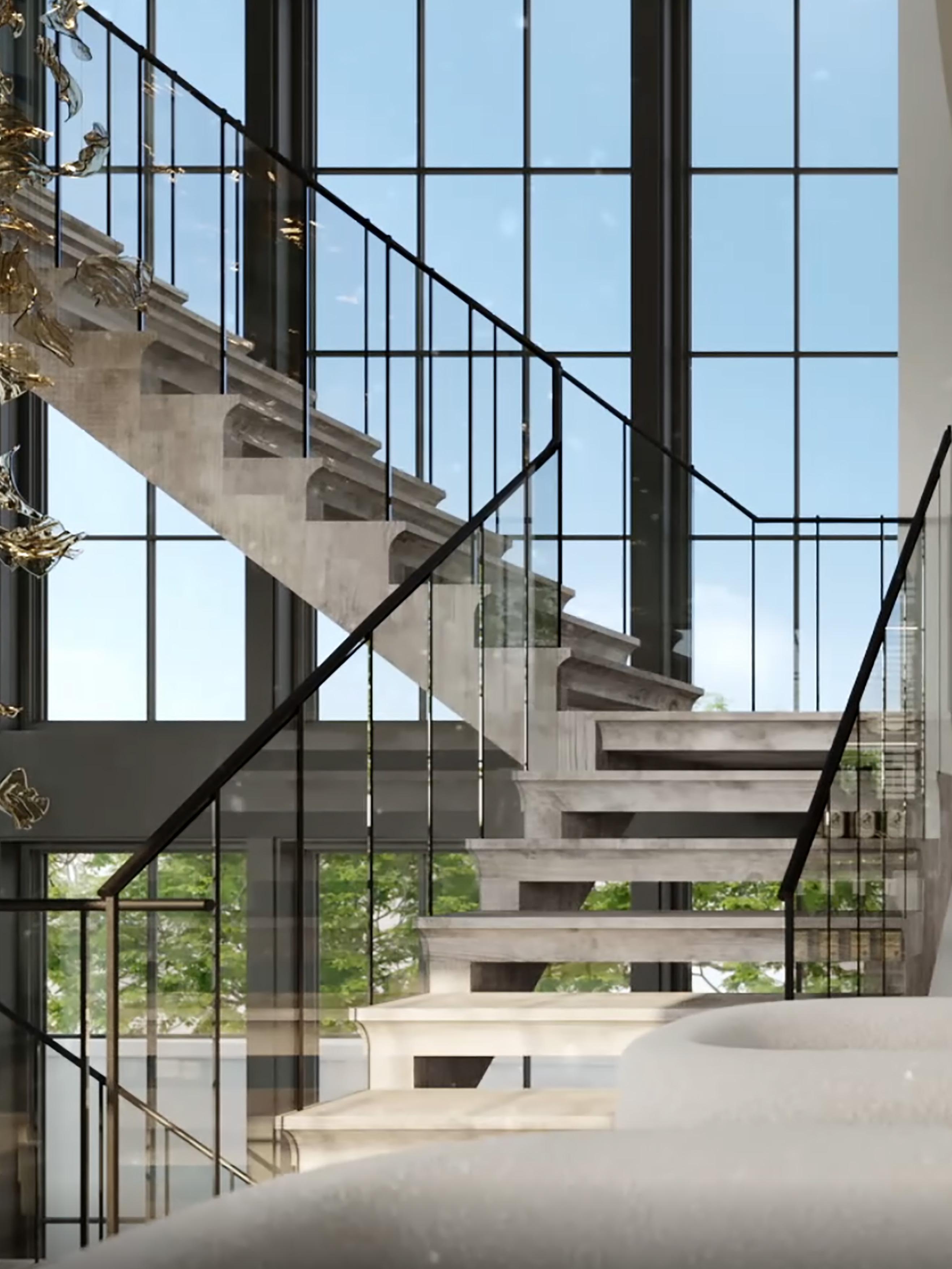 The living experience of the home was held in high esteem. We not only wanted to create an aesthetically chic and beautiful home, but also a livable beachside escape. The interior design carries the same line of thought β simplicity and functionality. Each floor features a glass elevator and wrapping grand staircase, all with the intention to obstruct as few exterior views as possible.