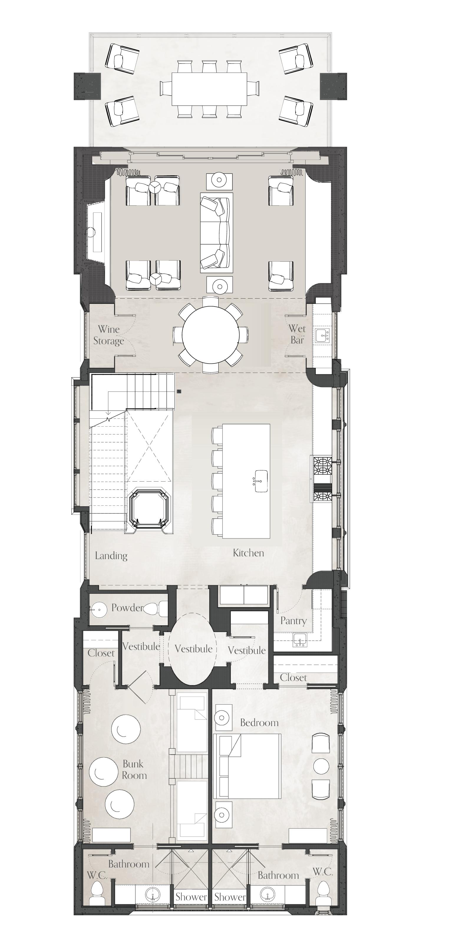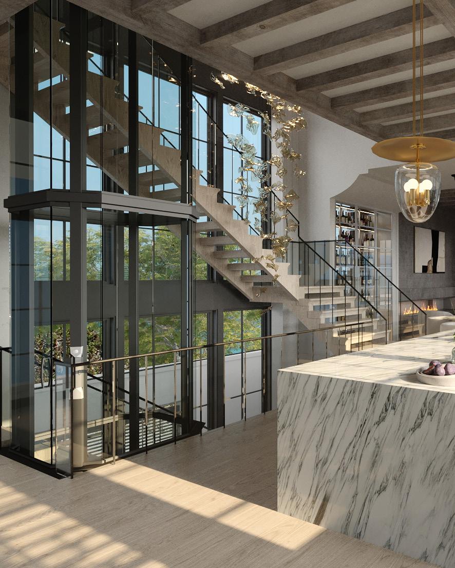 The great room is nothing short of a showstopper. The living space spans the entire width of the home and connects the adjacent porch and outdoor living space through French doors. With comfortable seating for nine, the space is punctuated by the incomparable floor to ceiling gas fireplace surrounded with fluted black stone, floating mantle and hearth. The space is complemented with a grand interior staircase touching each floor, and glass elevator beautifully filtering incoming light.