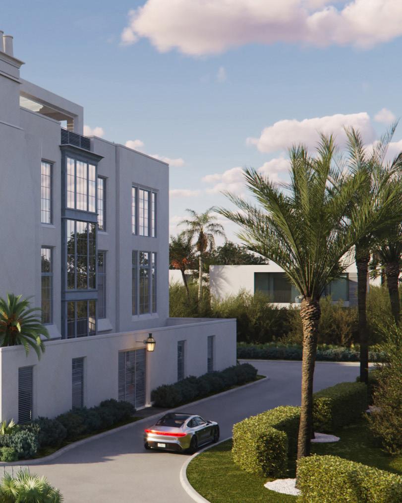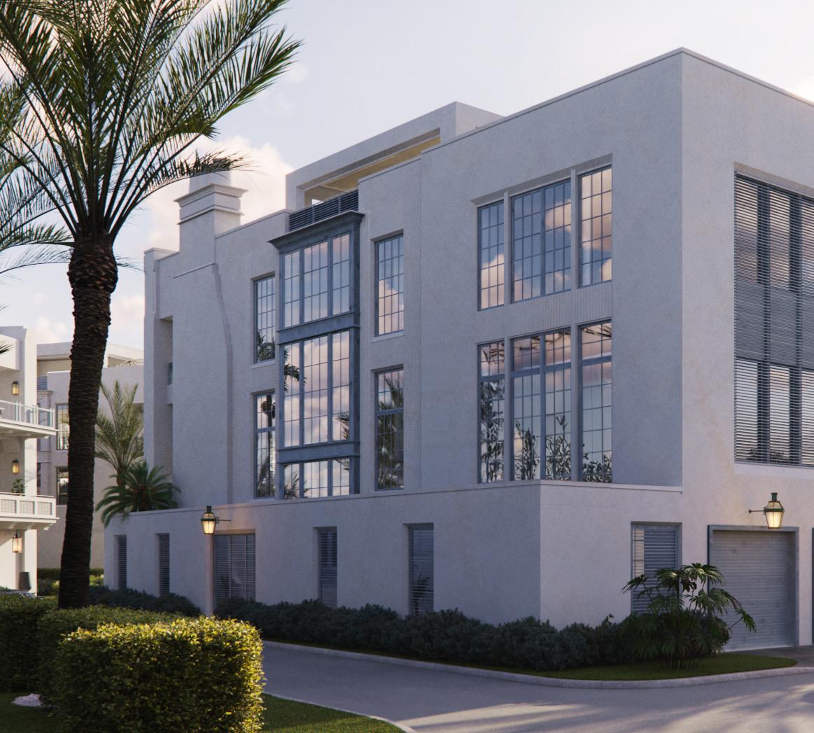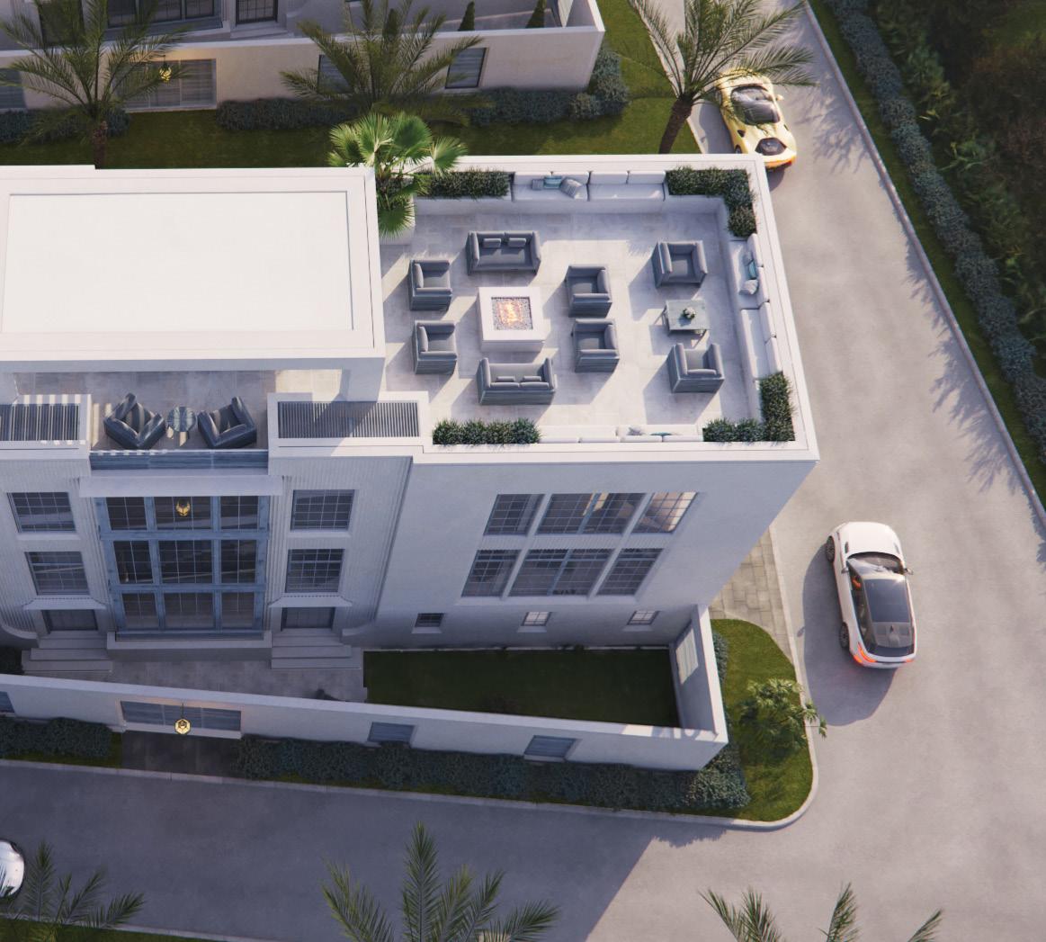 Take advantage of the Florida weather and entertain all year long. The ground floor contains a twenty-eight-foot cocktail pool, outdoor seating area, and floor to ceiling pivot doors connecting the outdoors to the interior passageways. The is an exterior staircase leads guests to the fourthfloor terrace, bypassing the private areas of the home. The terrace is a true fourth floor with identical dimensions to the rest of the floorplan with an additional rooftop pool, tanning ledge, outdoor kitchen, seating area and firepit. The home sits proudly on a corner lot, taking advantage of the sweeping views for sunset cocktails.