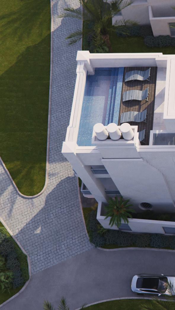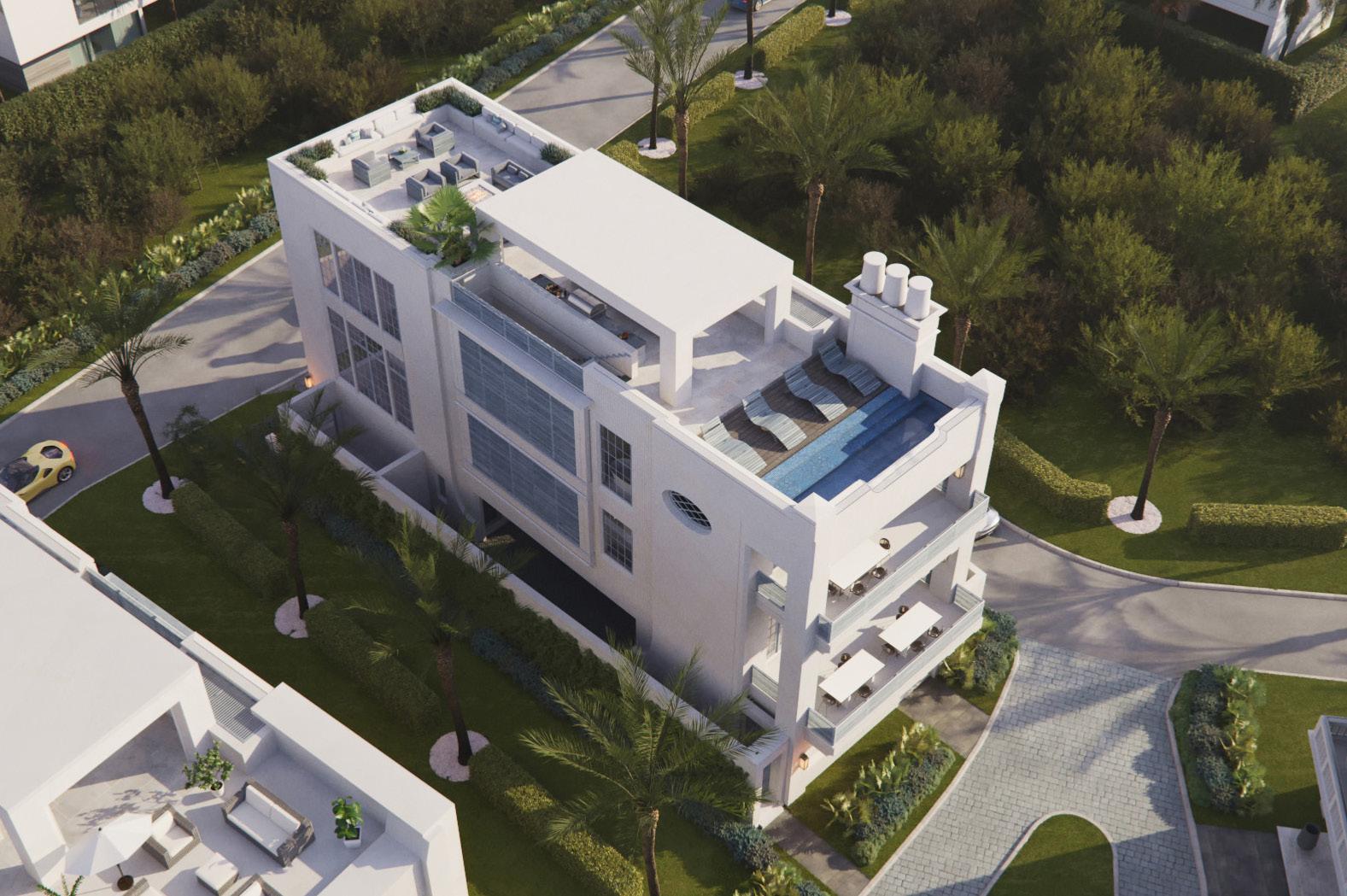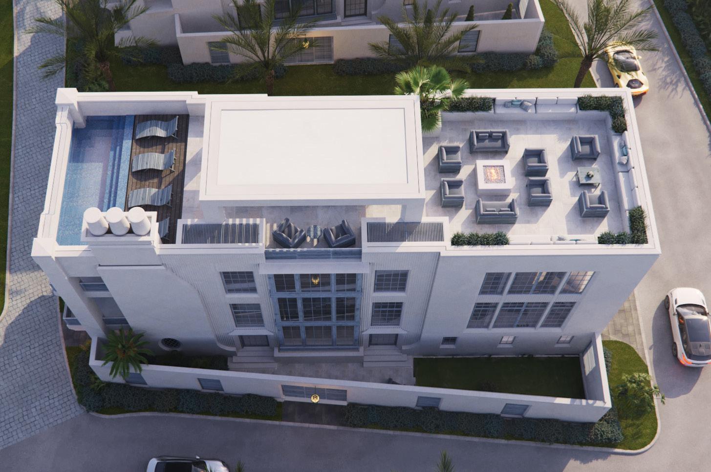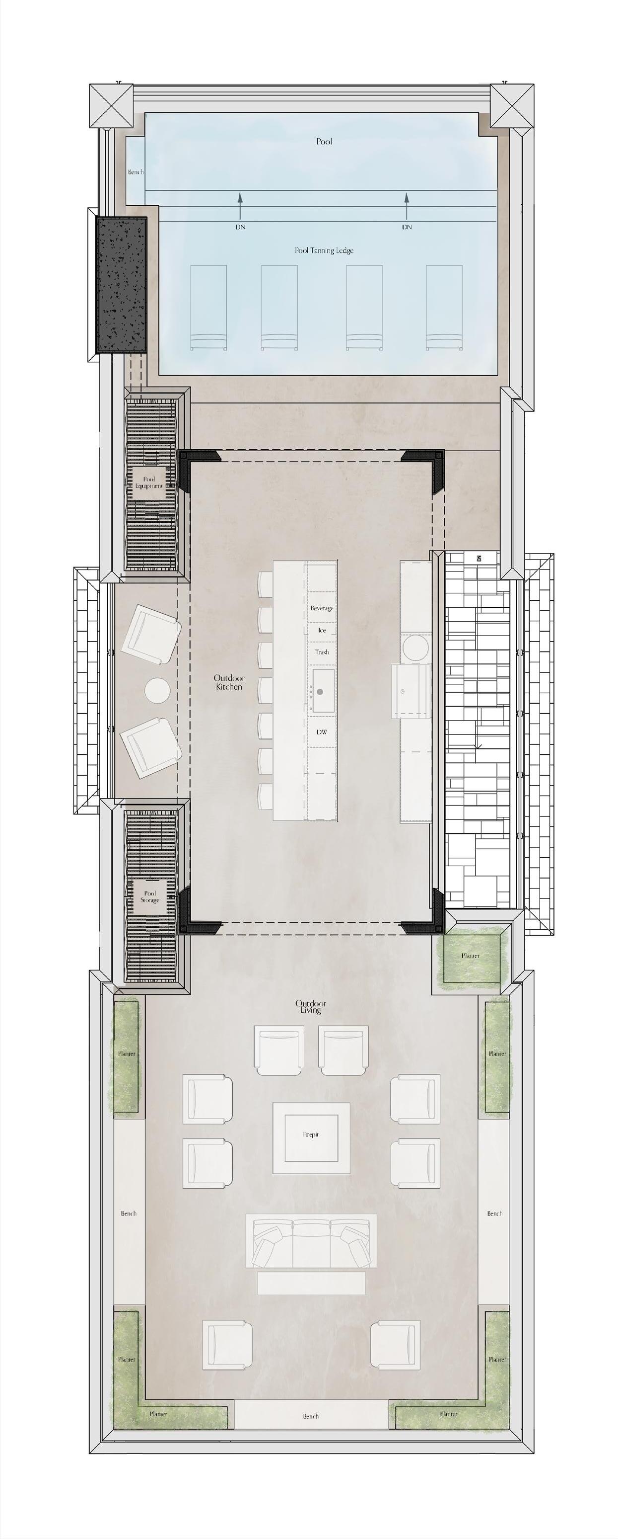Take advantage of the Florida weather and entertain all year long. The ground floor contains a twenty-eight-foot cocktail pool, outdoor seating area, and floor to ceiling pivot doors connecting the outdoors to the interior passageways. The is an exterior staircase leads guests to the fourthfloor terrace, bypassing the private areas of the home. The terrace is a true fourth floor with identical dimensions to the rest of the floorplan with an additional rooftop pool, tanning ledge, outdoor kitchen, seating area and firepit. The home sits proudly on a corner lot, taking advantage of the sweeping views for sunset cocktails.