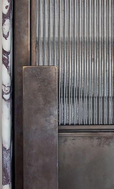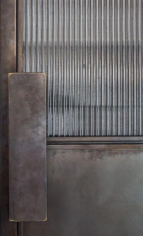 Integrated with the open concept kitchen, dining, and living areas, an adjacent wet bar enclosed behind custom doors is the perfect party trick. The intricate steel design is both form and function. Stowed away when not needed and open when entertaining, the moody colors and natural stone are sure to impress.