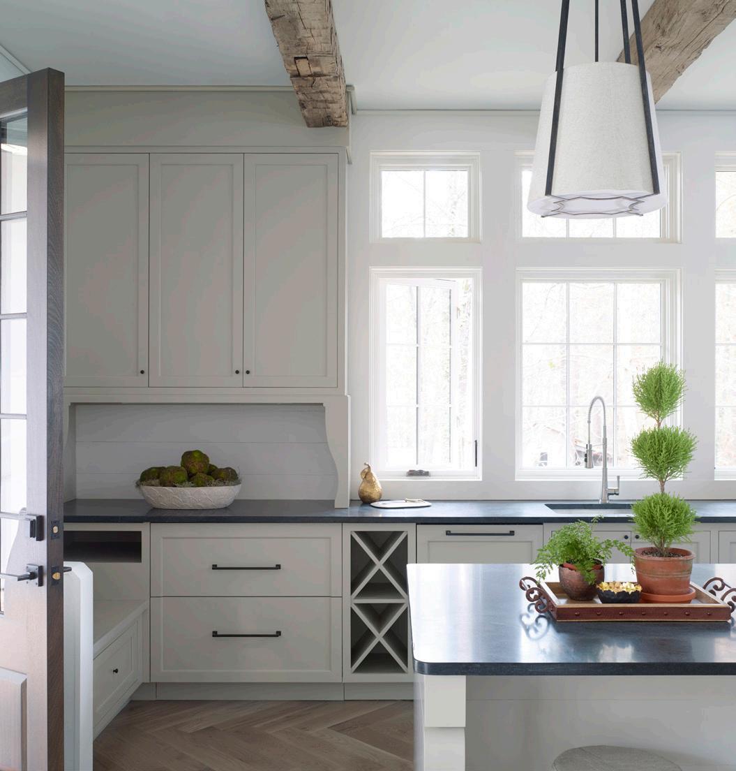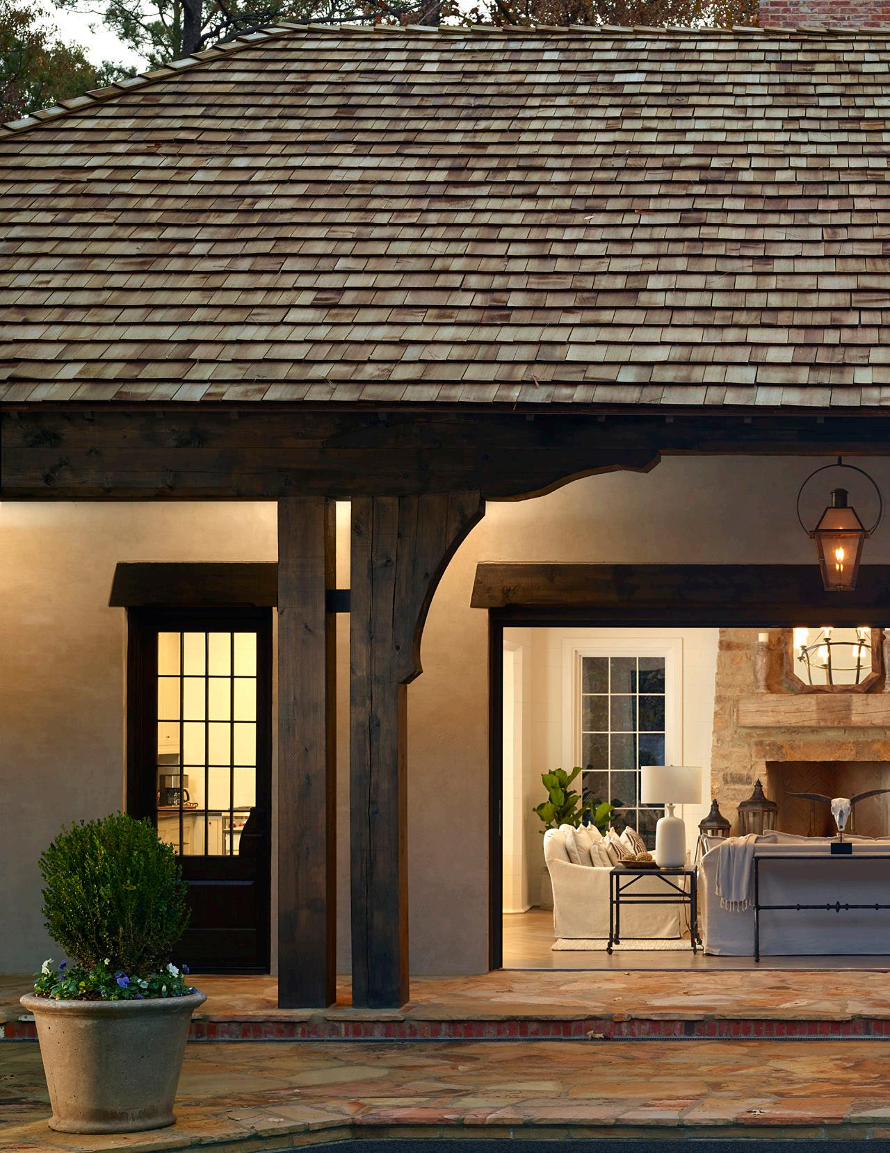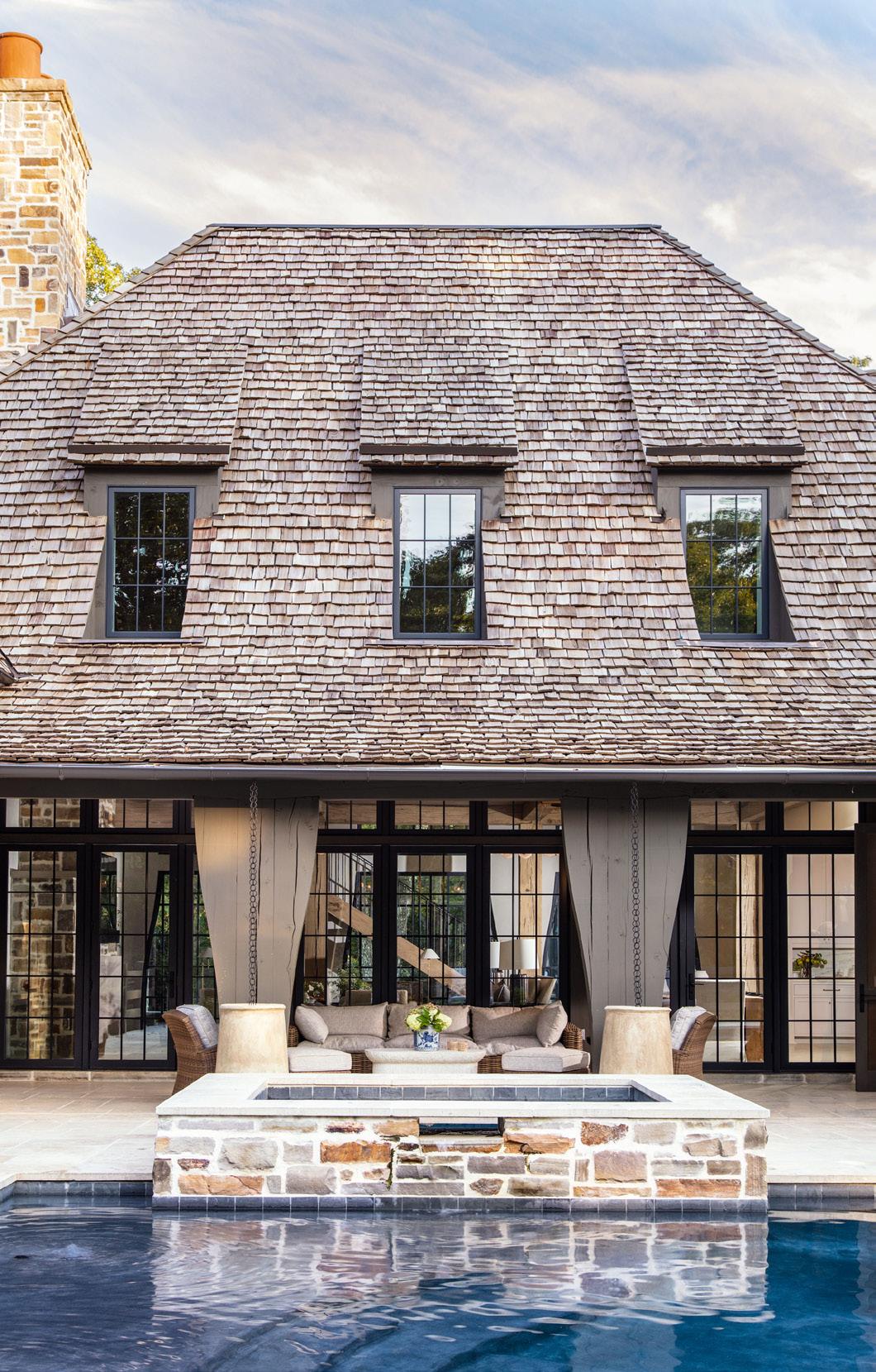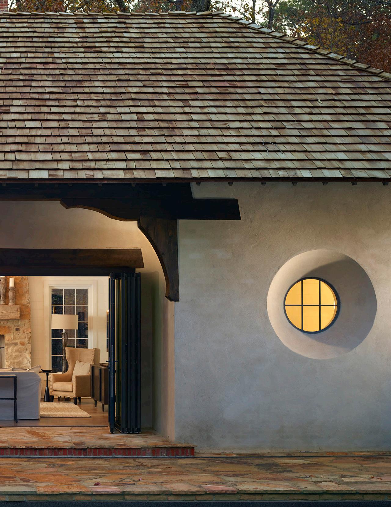 Centered on openness, this award-winning 5,000-squarefoot pool house doubles as an entertainment space and mother-in-law suite. A 16-foot movable wall connects the living room to the pool patio, while pine paneling, herringbone floors, and a stone fireplace warm the airy interior. Salvaged beams highlight the 20-foot ceilings, and cedar shake roofing with copper detailing completes the retreat.