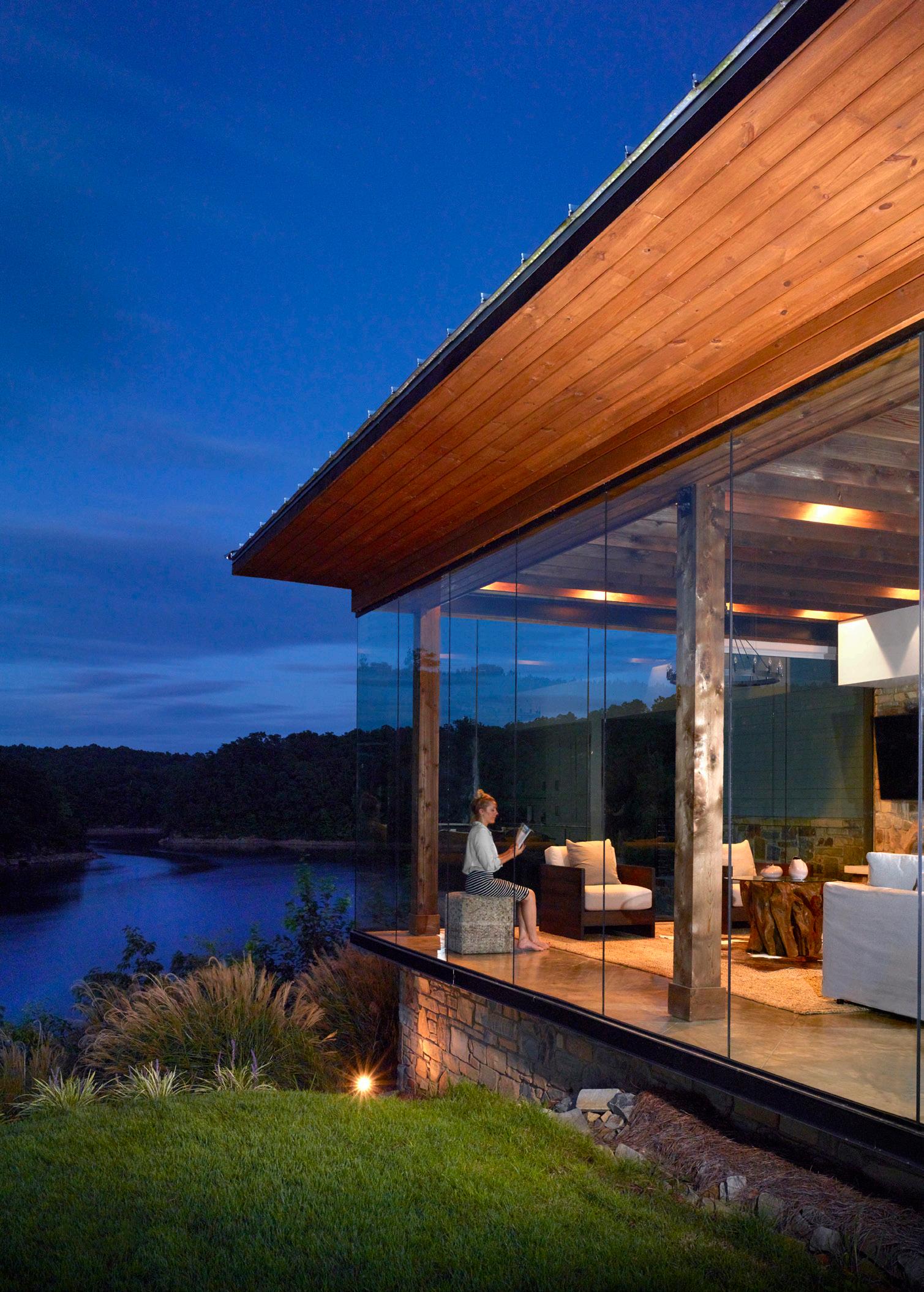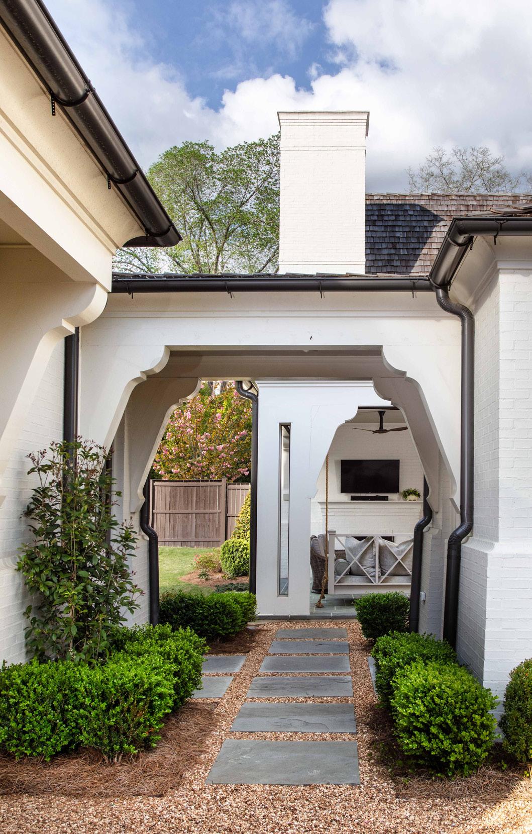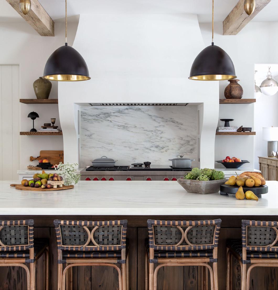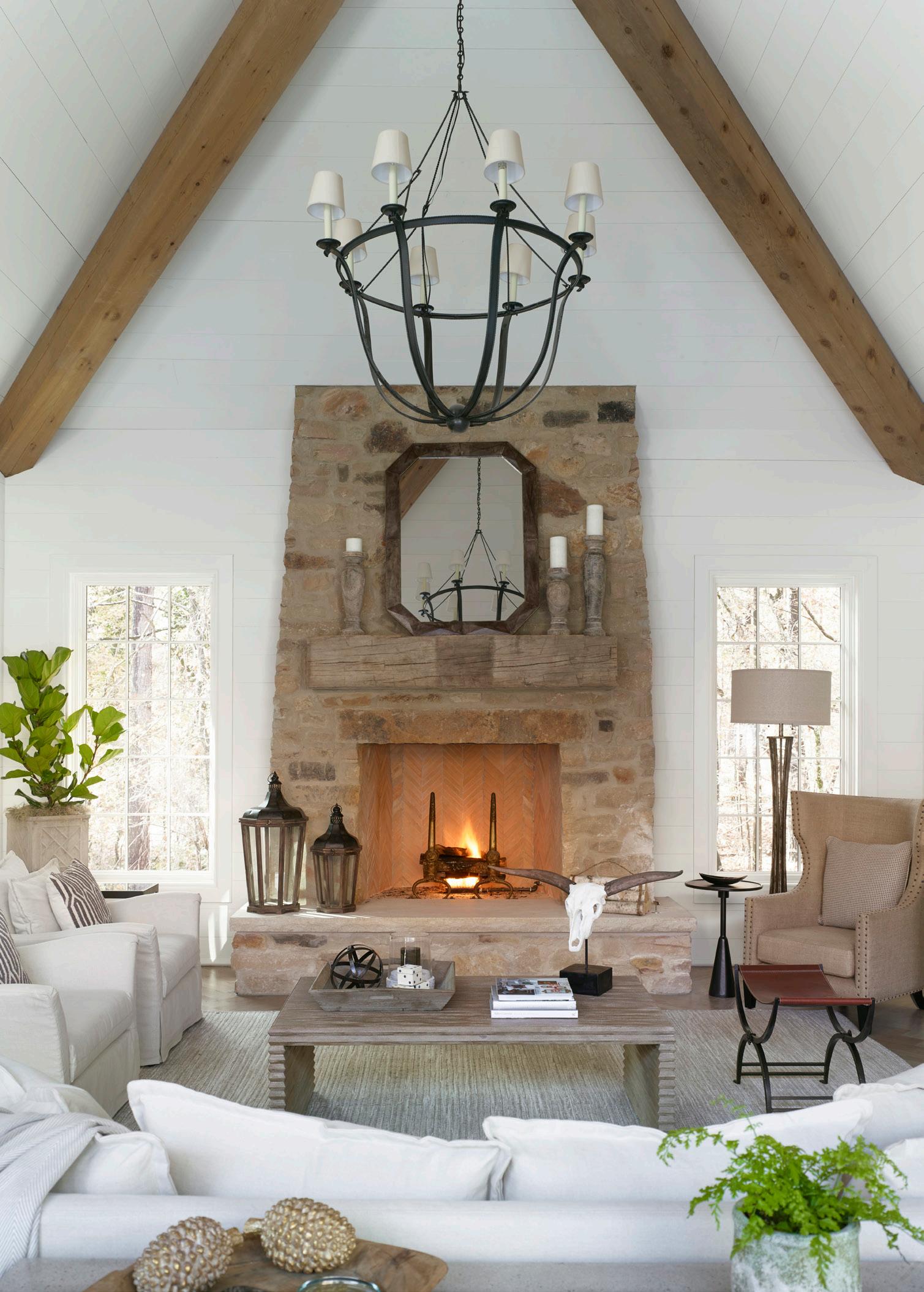Centered on openness, this award-winning 5,000-squarefoot pool house doubles as an entertainment space and mother-in-law suite. A 16-foot movable wall connects the living room to the pool patio, while pine paneling, herringbone floors, and a stone fireplace warm the airy interior. Salvaged beams highlight the 20-foot ceilings, and cedar shake roofing with copper detailing completes the retreat.