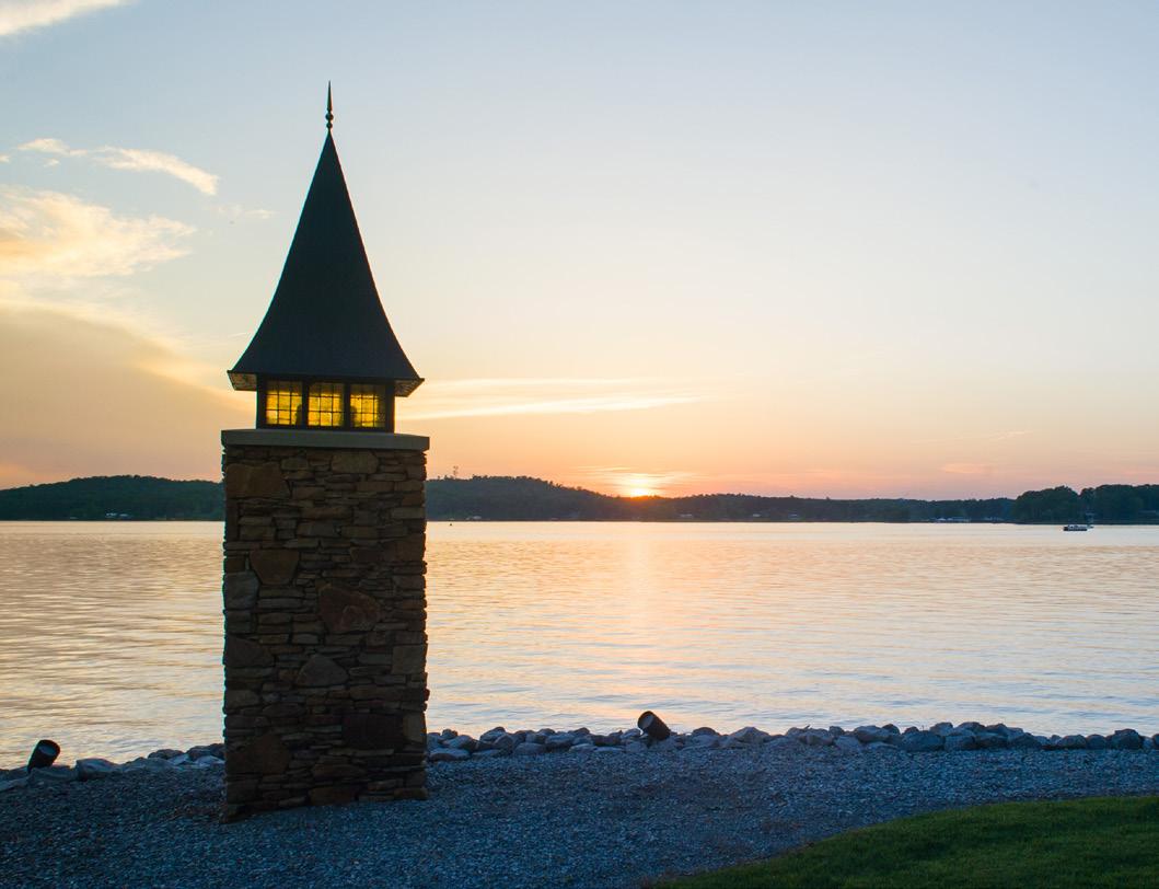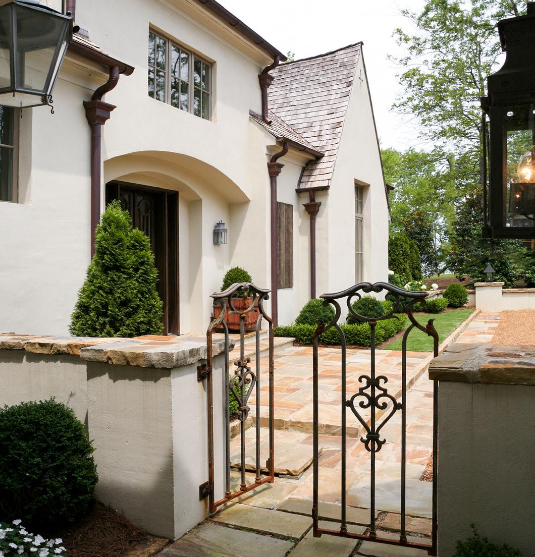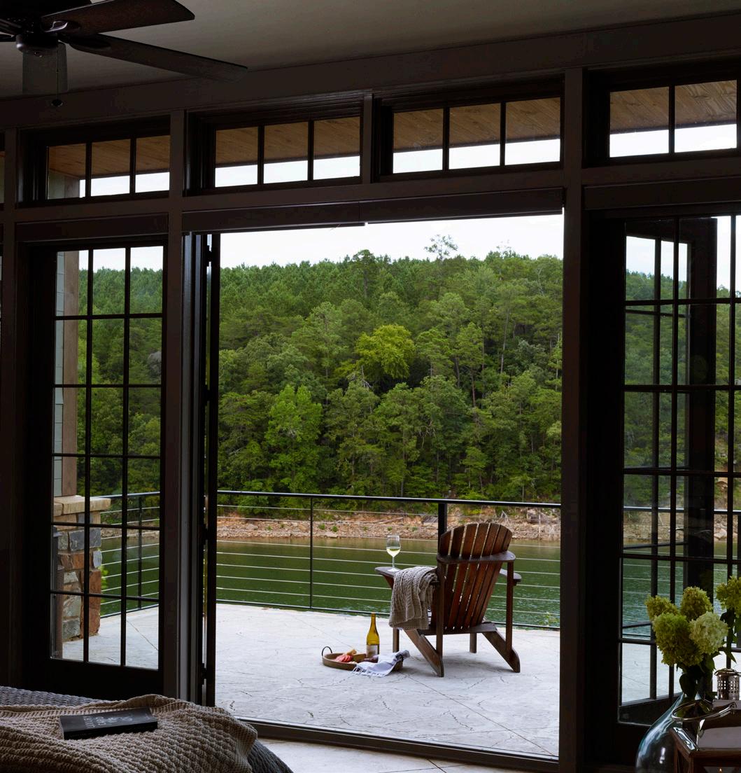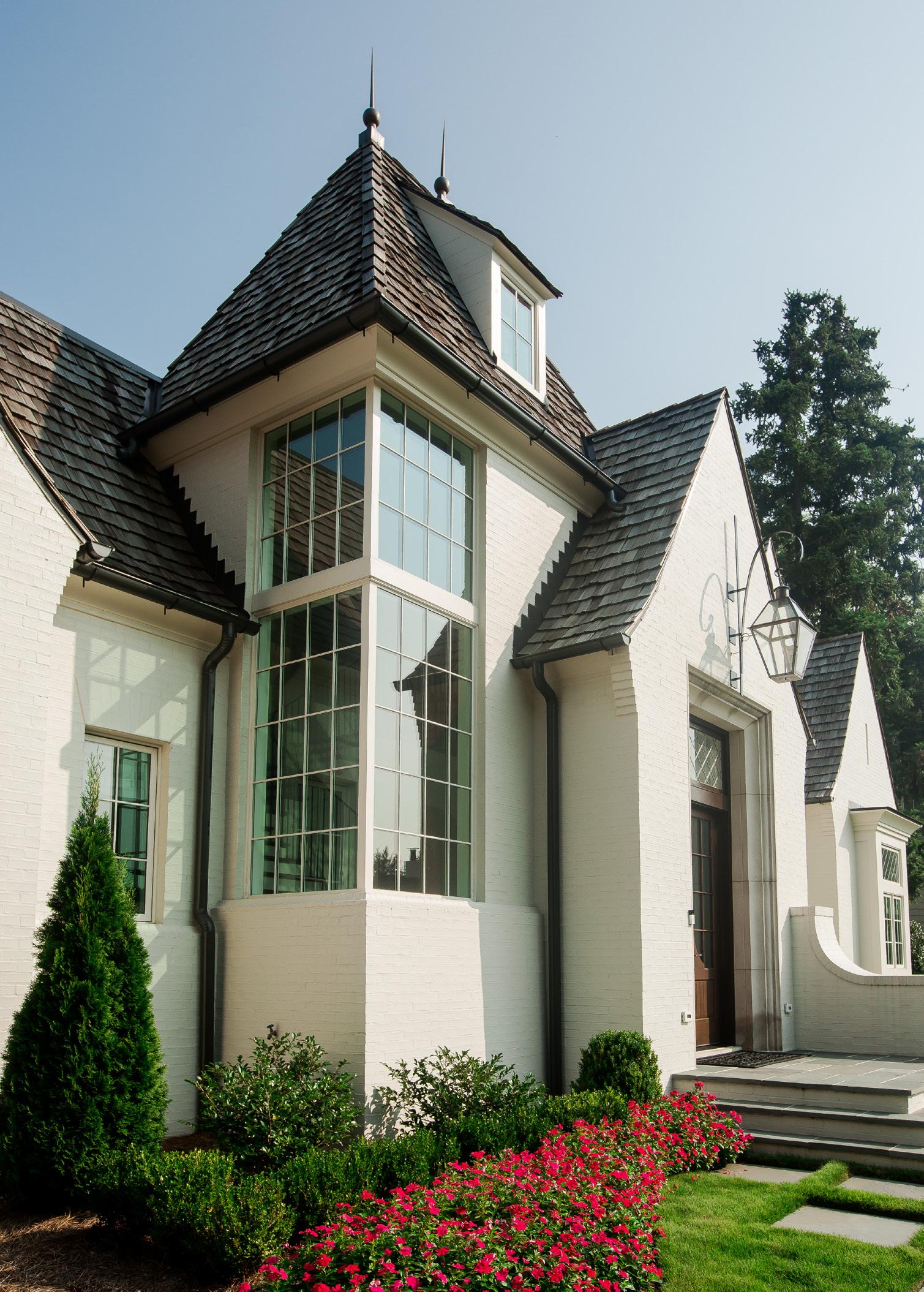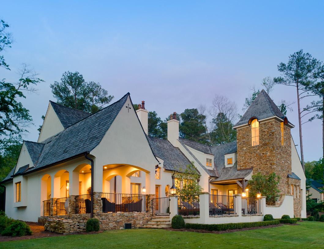 Arched doorways and steep roofs define this home, where stucco, stone, and wood blend seamlessly. A waterside turret—echoed by a small lighthouse—anchors the design. The landscape includes a layered bird sanctuary with canopy trees, shrubs, grass, and water. Inside, Frenchinspired casement windows and rustic wood beams add warmth throughout.
