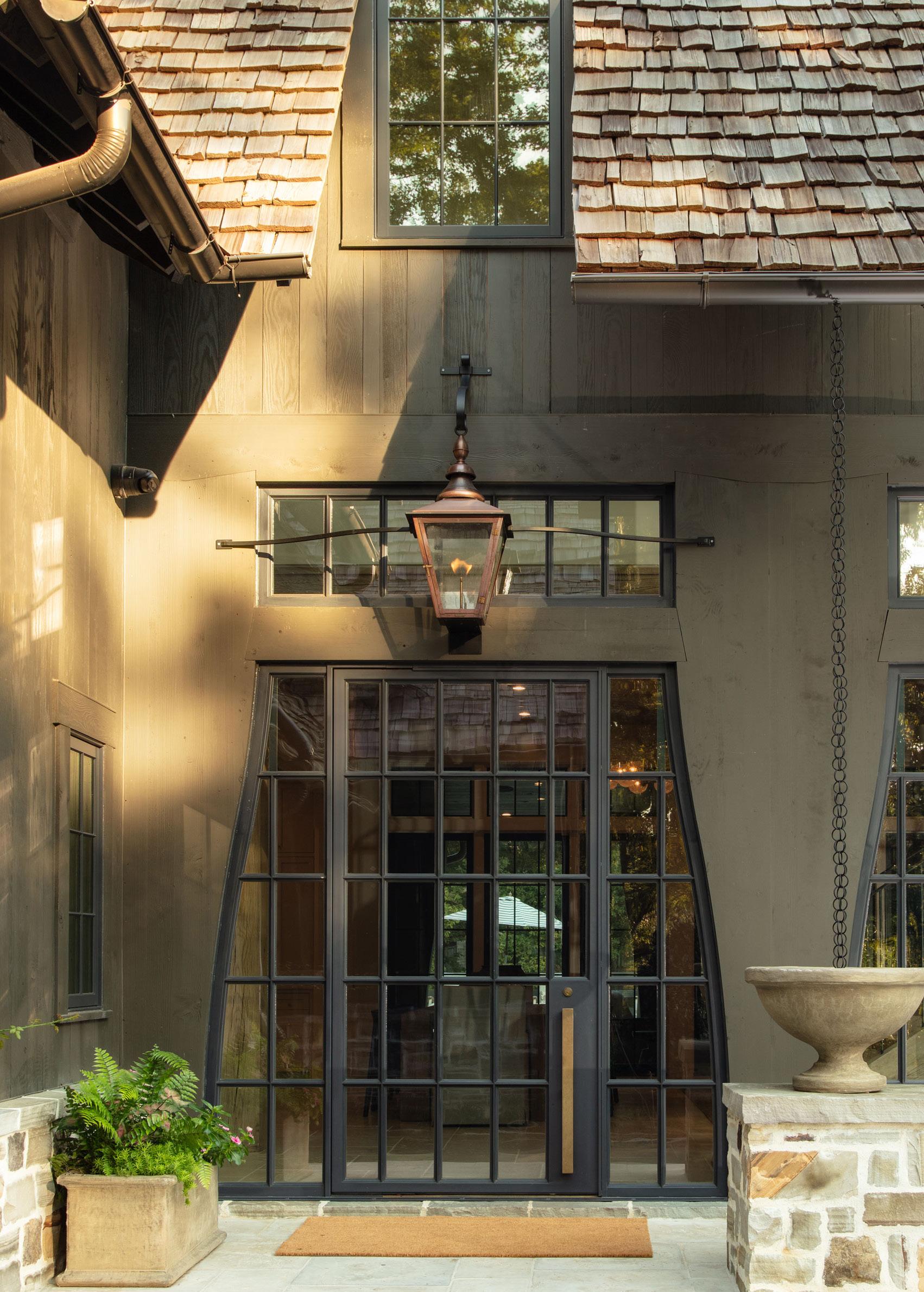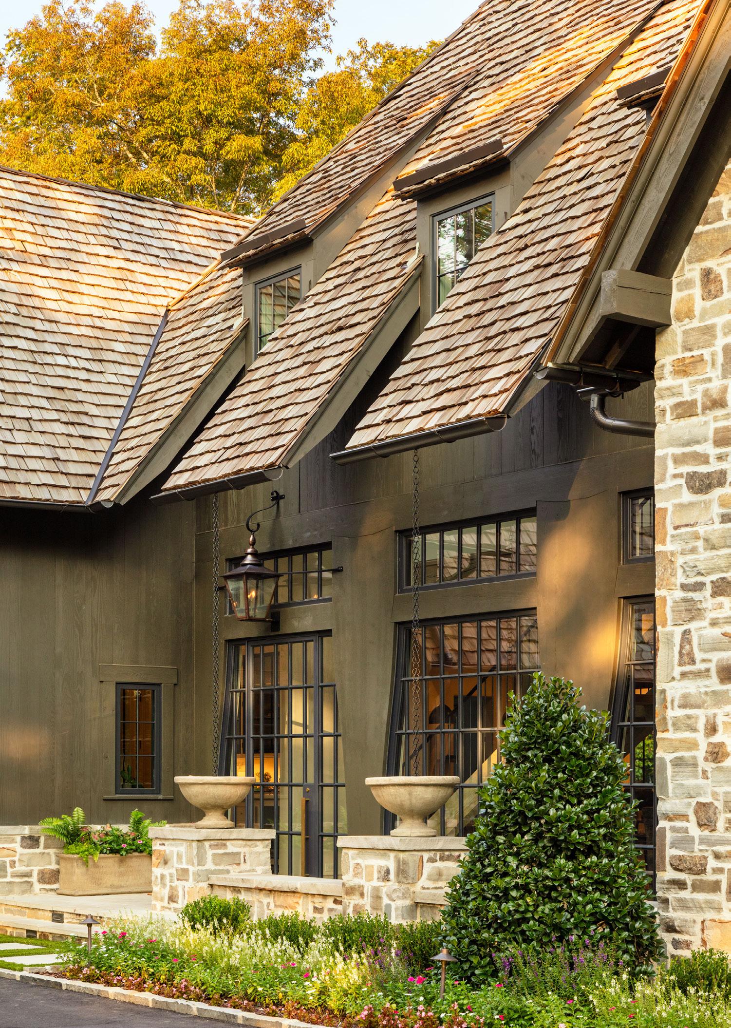 Designed as both a family home and a response to its former llama farm setting, this residence blends rustic charm with modern refinement. Cedar shake roofing, local stone, and exposed timber create a cohesive, timehonored palette. Gabled forms, a leaded glass window, and a custom steel pivot door define the façade, while thoughtful detailing and a seamless indoor-outdoor flow connect the home to the land.