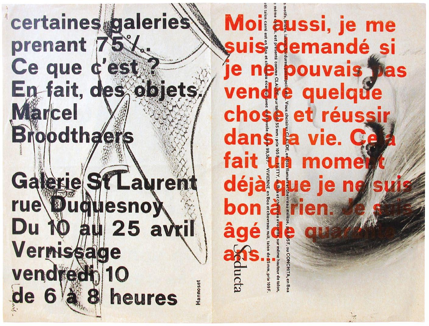 'Moi aussi, je me suis demandé si je ne pouvais pas vendre quelque chose et réussir dans la vie. Cela fait un moment déjà que je ne suis bon à rien. Je suis âgé de quarante ans ... [printed in orange] L'idée enfin d'inventer quelque chose d'insincère me traversa l'esprit et je me mis aussitôt au travail. Au bout de trois mois, je montrai ma production à Ph. Edouard Toussaint la propriétaire de la galerie Saint Laurent. Mais c'est de l'Art, dit-il et j'exposerais volontier tout ça. D'accord lui répondis-je. Si je vends quelque chose il prendra 30%, Ce sont, paraît-il des conditions normales certaines galeries prenant 75%. Ce que c'est? En fait, des objets. Marcel Broothaers ... [printed in black]'.