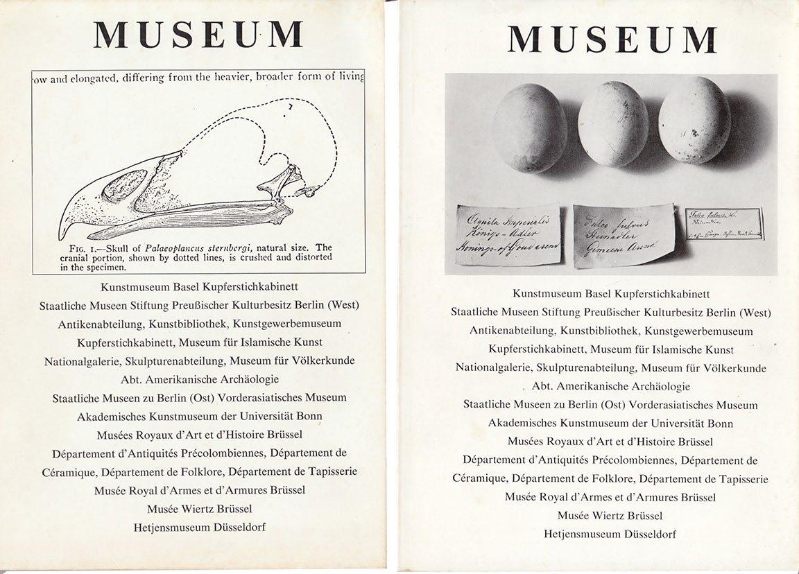 Broodthaers' exhibition was held in the Städtische Kunsthalle Düsseldorf from 16th May - 9th July, 1972. Designed by the artist himself, the extensive catalogue contains entries and statements by the artist, together with a detailed catalogue of works, an encyclopedia (A - M in vol. I, M - Z in vol. II), bibliography and extensive illustration; unsurprisingly given Broodthaers' title, 'Der Adler vom Oligozän bis heute' (The eagle from the Oligocene [era] to today) the images are dominated by that of the eagle. The Oligocene was a geological epoch beginning approximately 34 million years ago although the eagle as a genus ('aquila') appears to have evolved in a later era, the Miocene.