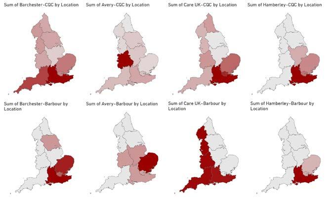 – Barchester and Hamberley focus on where they already have homes in the South East. In contrast, Care UK has a strong pipeline in the South East but is also developing its presence in the South West, making it the only major operator to clearly focus on the west of England. Avery is expanding in new geographies that avoids the need to pay premium South East prices for land and has switched focus from the West coast to East coast.