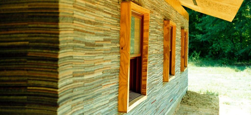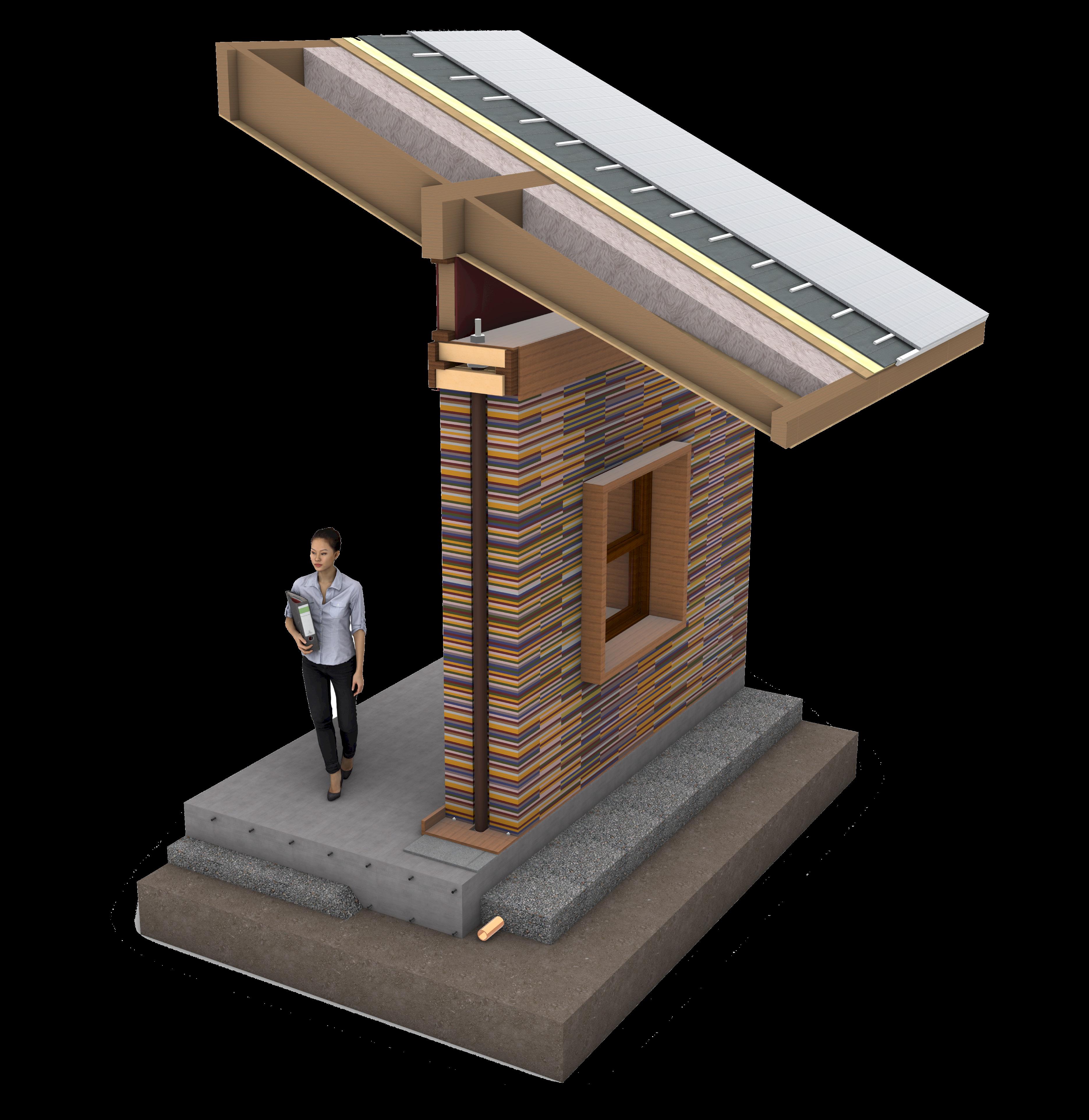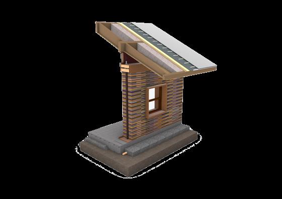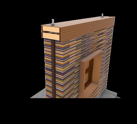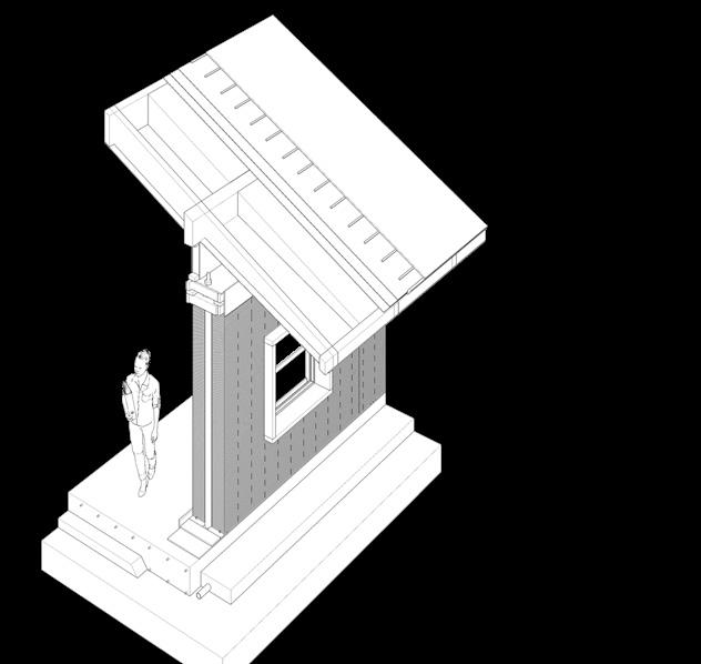 FRAGMENT SELECTION: The chosen fragment is the environmental barrier between Alabama's climate and one of the childrens bedrooms. How does it compare to UK regulations for bedrooms: - Ventilation and air quality system from the window creating adequate air quality - Insulation and soundproofing are both qualities that are inherent to the stacked carpet tiles. - In PART L new buildings have to achieve a U value of 0.18 W/m²K. and this achieves 0.12 W/m²K. - Regulations address solar gain which is addressed by the roof overhang and window depth. LUCY CARPET HOUSE: FRAGMENT: All content highlighted or associated with a dashed orange line should be read as speculative. The carpet tile acts as a wall structure whilst providing insulating qualities, water & fire resistance. CARPET TILES: The carpet tiles are stacked in similar way to a standard brick bond, overlapping to increase overall strength and load bearing qualities ELASTOMETRIC EXTERIOR COATING. Donated hydro stop. MINWAX LIGHTING: discounted Tuscaloosa electric. Used to protect exposed timber and to create an aesthetic finish. CORRUGATED METAL SHEETING. Is the outermost layer, serving as the protective and visually defining 'skin' enveloping the roof structure. The incorporation of donated carpet tiles from Interface presents a strategic cost-saving measure for the project. These tiles are typically donated due to defects or overproduction, offering a sustainable sourcing solution. To ensure safety and quality, the carpet is stored for seven years to allow any fumes or chemicals to dissipate before installation. Upon arrival at the site, the carpet undergoes several treatments to enhance its durability and resilience. Anti-pest and anti-microbial properties are applied, along with fire-retardant liquids as a precautionary measure. The carpet tiles exhibit low flammability under compression, attributed to the oxygen-depleted environment within the wall assembly. Furthermore, the waterproofing of the tiles involves coating them with an elastomeric substance. This coating not only renders the carpet impermeable to moisture from rain and wind but also serves to prevent dampness within the wall structure. RIBA SUSTAINABLE GOALS: TIMBER RING BEAM. Used for compression of carpet tiles and also supported by steel frame The FCBS carbon Calculater gives a representation of where the most embodied carbon is found in my fragment. As expected the most embodied energy is found in the foundations of reinforced concrete. Due to the materiality of the external walls being recycled sequestering carbon carpet tiles and steel frame there is very little embodied energy in the walls. Timber frame roof structure Timber frame roof structure clad in corrugated metal Timber structure interior walls Timber structure with polycarbonate sheeting Compression Beam Steel frame Double glazed windows with timber lintel and frame Reinforced concrete basement Skylight window Carpet tile wall build up Concrete foundations SUN PATH: The sun path Has effected the orientation of the building where there is less glazing facing south to prevent solar gain and there is a roof overhang and deep window lintels to prevent direct solar gain during months of summer solstice. WIND DIRECTION: The prominent wind direction is from the South West. The building is sheltered by trees on its SW so there is little need for design alteration for wind. SW Winds A diagram depicting the prevention of solar gain and water run off and cooling through concrete foundation. Rain Sun Ray Cooling DESIGN METHODOLOGIES: FIRE RESISTANCE CONSTRUCTIBILITY ENVIRONMENTAL TECHNIQUES With a constrained budget, it's reasonable to expect limited resources for prototyping. In order to construct the carpet tile wall effectively, the carpets would have needed to be stacked higher than the intended height, anticipating compression during installation. To grasp this concept, conducted prototyping test, akin to what students might have undertaken, to estimate the height change of carpet under compression but on a smaller scale. Using four stacked carpet tiles, measured the height before and after compressing them with the weight of a person. Through this experimentation, we discovered that the primary compression and height alteration occur in the yarn, while the backing experiences relatively minimal change in height under compression. This insight also sheds light on how the tiles achieve fire resistance, as there is no space for oxygen, and clarifies how the wall build-up enhances weather resistance, effectively becoming wall primarily comprised of backing with thin layers of insulation interspersed. With principles adjacent to the "&" Atelier, this design prioritizes material selection as its foundational aspect. It's this approach that enables it to significantly address five of the RIBA & UN Sustainable Design Goals Outcomes. The project exemplifies a building that received materials first, compelling the team to find innovative ways to utilize them efficiently. Since the tiles are reused, their carbon footprint is already enclosed within them, making them a superior choice compared to traditional wall constructions. This approach underscores a sophisticated understanding of sustainable practices and demonstrates a commitment to minimizing environmental impact. Highlighted are the principles that this building addresses: 7. Affordable and clean energy operational energy 9. Industry, innovation & infrastructure 11. Sustainable cities and communities social value 12. Responsible consumption and production - embodied energy 13. Climate action. This building also addresses issues on equality as it is designed for the community and was a project that was constructed with community engagement. Analysing the integrity of the wall build up against the UK building regulations provides a better understanding of the efficiency of the building. Part B of the fire regulations goes into depth on information about fire regul