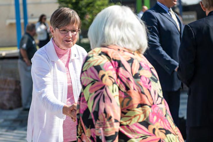 Gov. Laura Kelly met with members of the Patriot Guard Riders outside the Kansas State Capitol before a ceremonial bill signing event June 24, 2021.