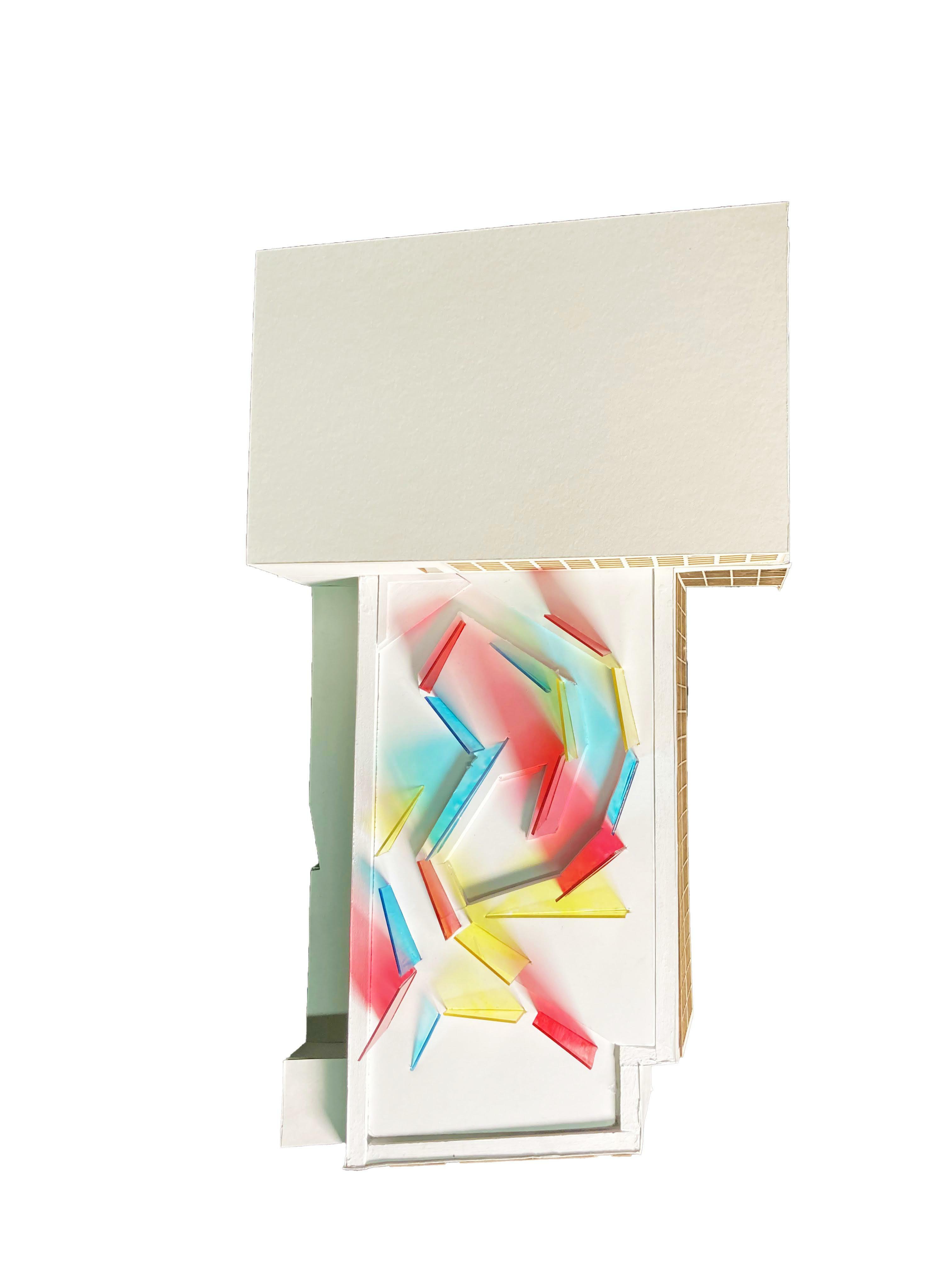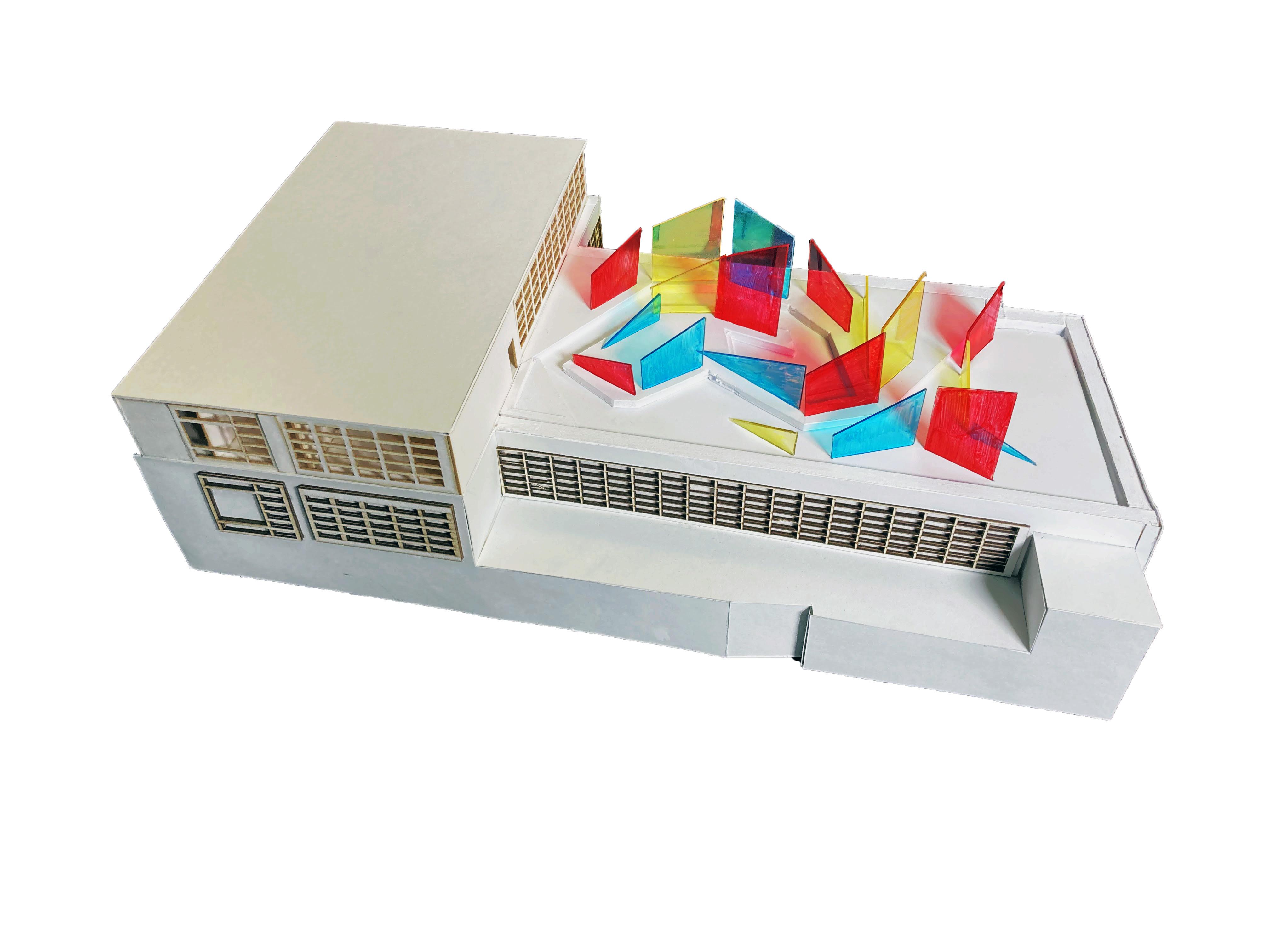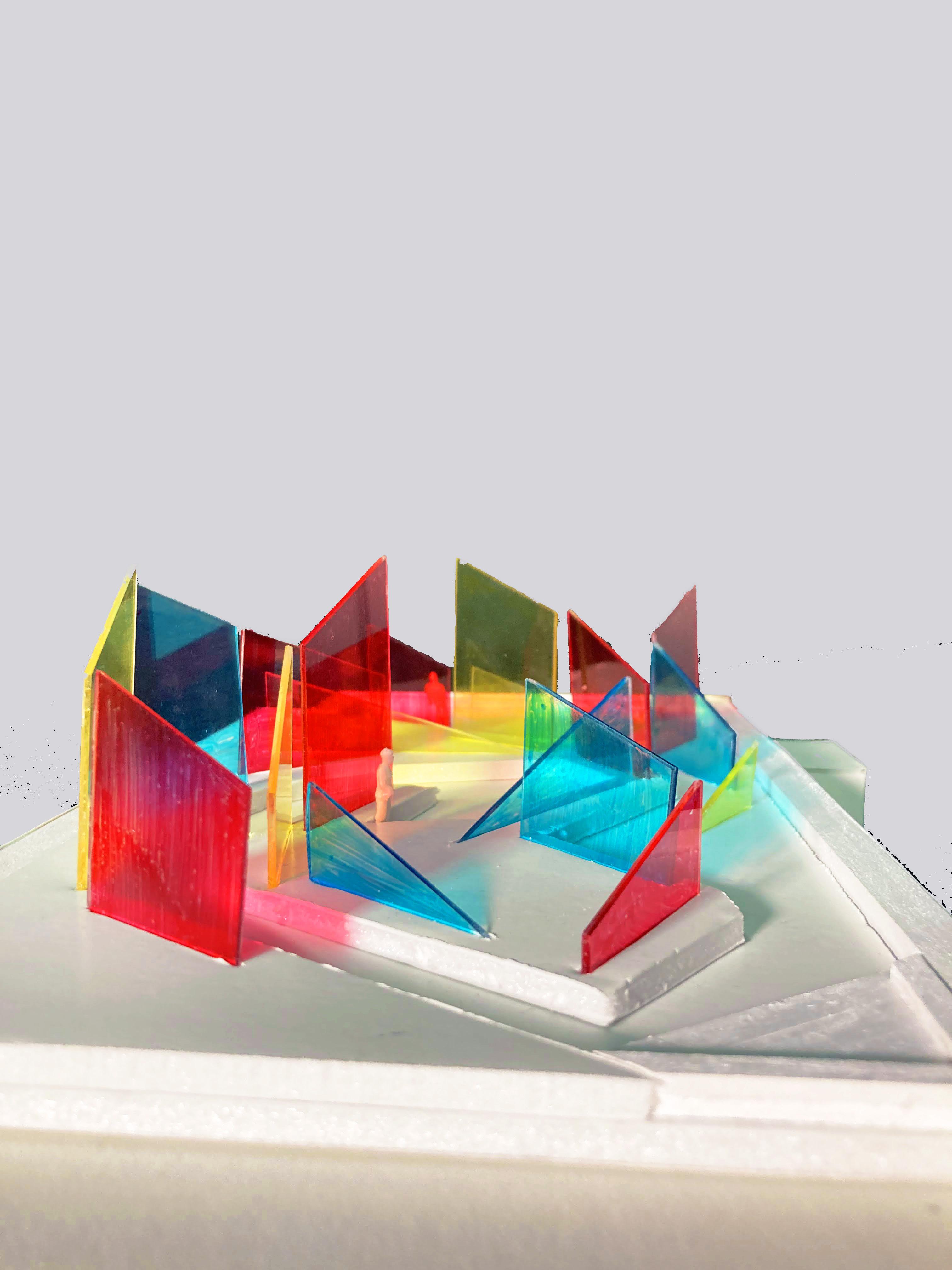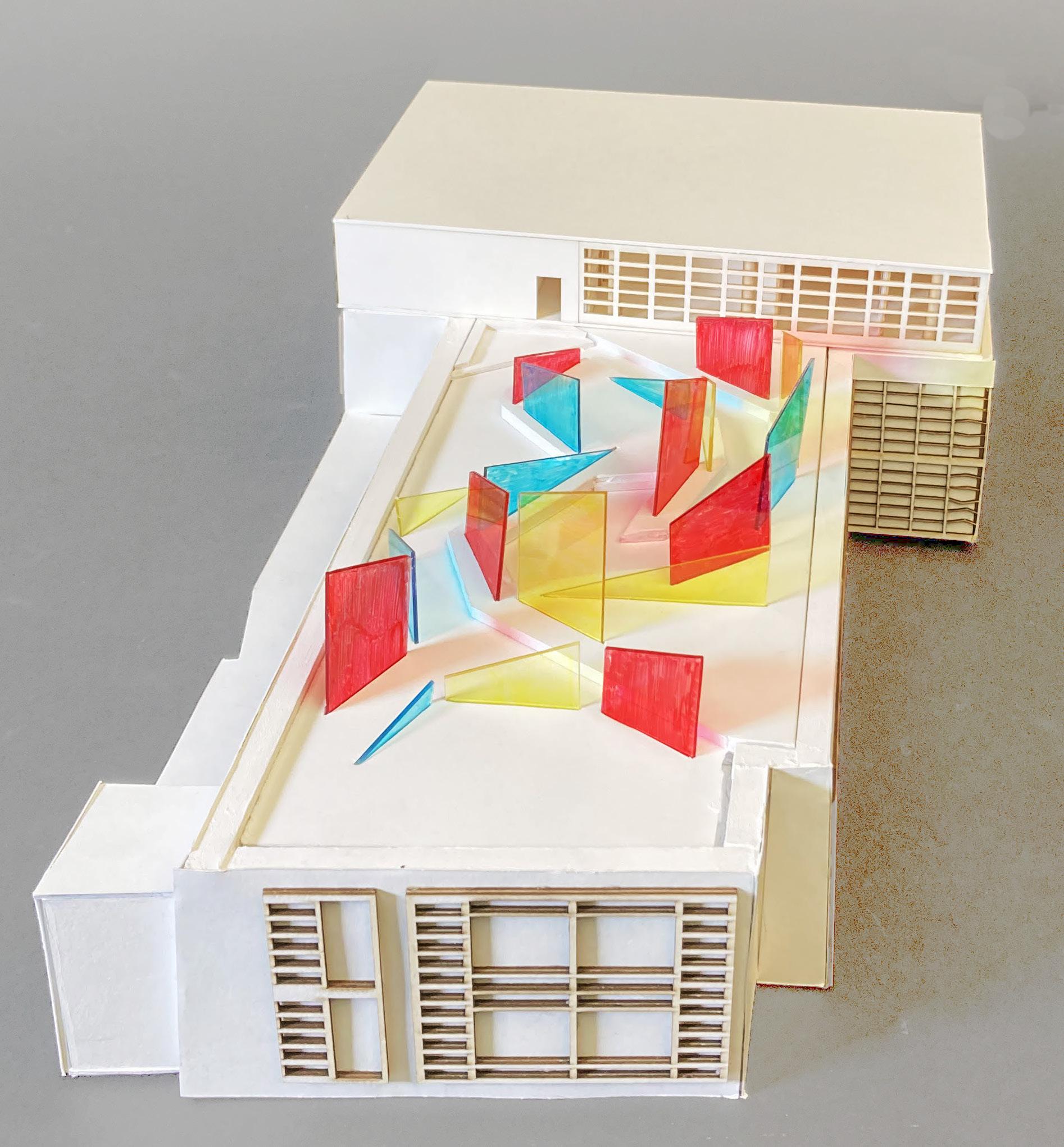 This project focused on a way to allow circulation and gathering on the green roof atop the architecture building. This pavilion serves as a gathering space for students and faculty who are in a high stress environment. Through the addition of colored glass panels, the space transformed into a playful, yet relaxing getaway.