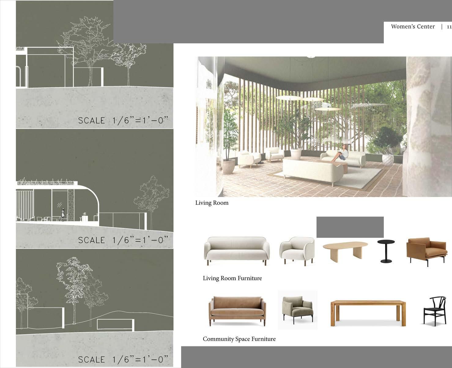 The center is surrounded by trees and various landscapes which enhances the sense of privacy, safety, and securty. There are various exterior moments throughout the site which allow the women to step away for a private moment and spend time in nature. Glass was used to separate the interior and exterior space, but still seek to unify them through mere visibility. The soft and natural materials continue to patio spaces and the walls surrounding the site.