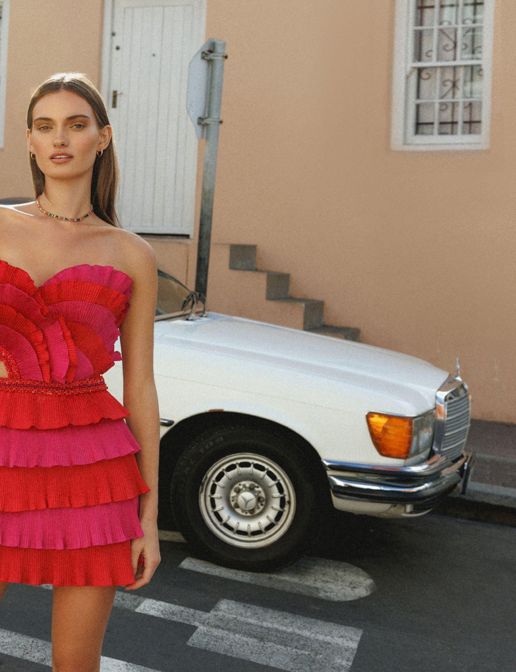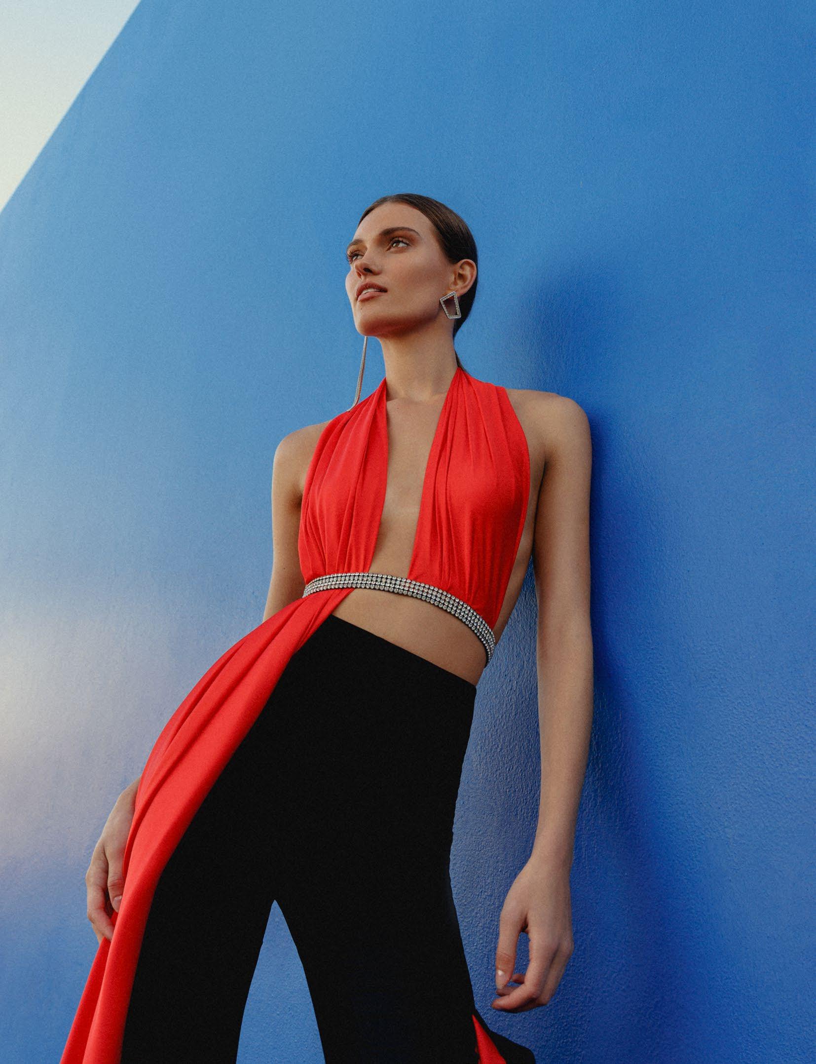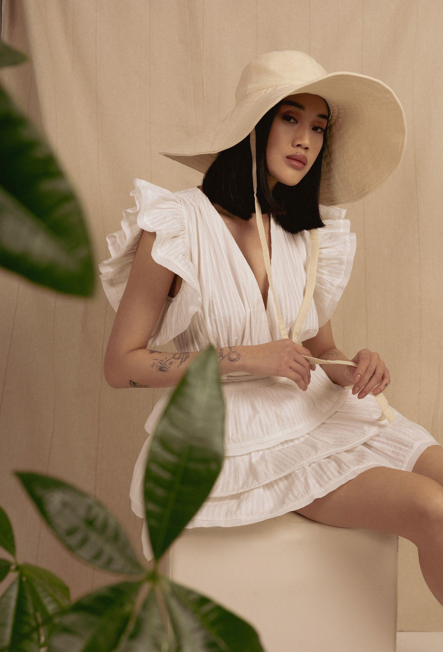 Photographer Stephanie Diani @stephaniedianiphoto Photo Assistant Luke Nilsson @luke_at_this_photo Model Frances Li @frannielikesyou Stylist Christine Manthey @msmanthey Hair & Makeup Madge Earle @iammadgeearle Dress Victor Lopez @victorlopezny Jewelry Erickson Beamon @ericksonbeamon opposite page Top & Shorts Haleia @haleia Jewelry Sultry Affair Style @sultryaffair.style
