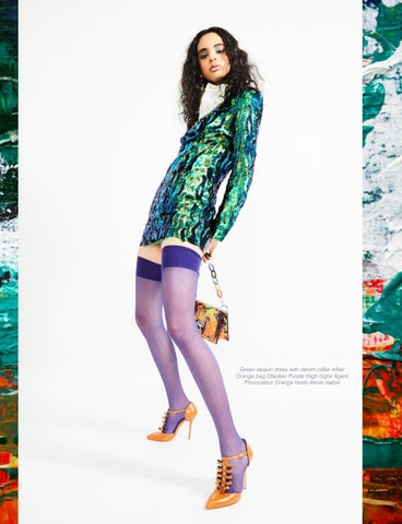 Green sequin dress with denim collar Affair Orange bag Ofaolain Purple thigh highs Agent Provocateur Orange heels Alexis Isabel