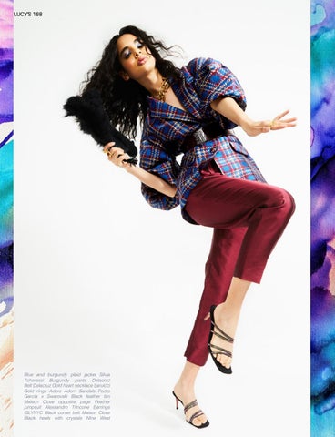 Blue and burgundy plaid jacket Silvia Tcherassi Burgundy pants Delacruz Belt Delacruz Gold heart necklace Laruicci Gold rings Adore Adorn Sandals Pedro Garcia x Swarovski Black feather fan Maison Close opposite page Feather jumpsuit Alessandro Trincone Earrings ISLYNYC Black corset belt Maison Close Black heels with crystals NIne West