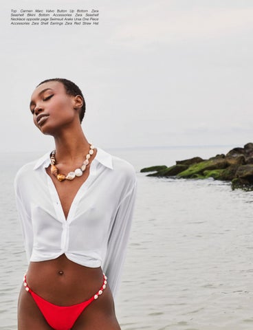 Zara Seashell Bikini Bottom Accessories Zara Seashell Necklace opposite page Swimsuit Araks Ursa One Piece Accessories Zara Shell Earrings Zara Red Straw Hat
