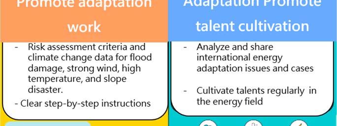 Extreme climate risk assessment criteria applicable to the energy sector for flooding, strong winds, high temperature and slope disasters have been successively developed and provided to the energy sector, along with climate change risk assessment guidelines, maps and platforms to guide energy companies to assess the impact of climate change and relevant risks on energy facilities. In addition, climate change adaptation management procedures have been promulgated for the manufacturing industry to help manufacturers assess transition risks and costs, and enhance their ability to adapt to climate change.