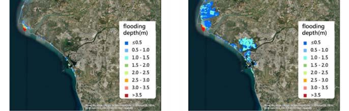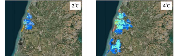 Under the worst future warming scenario (RCP . ), the wind speed of typhoons will increase by about % to % at the end of the century, with an average increase of %. Due to its innate geography, the impact of typhoons and waves along the coast of Taiwan is greater on the northeast and southeast coasts, while the impact of storm surges is greater on the north, northeast and central coasts, therefore the impact on these areas will be higher than other areas under the warming scenario. According to the IPCC AR , in a °C warming scenario, the sea level around Taiwan will rise by about . meters, and in a °C warming scenario, the sea level will rise by . meters. Taking the Taipei metropolitan area as an example, sea level rise may lead to flooding in areas mainly located in the estuary of the Danshui River. Under the protection of existing dikes, the impact on urban areas will be relatively small. In southwestern coastal areas such as the Tainan area, sea level rise may cause an overflow in lowlands, especially in coastal fish farms, wetlands, and sandbars (Figure ).