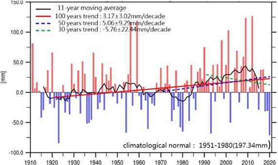 Fig. Annual maximum -day precipitation amount change trend in Taiwan