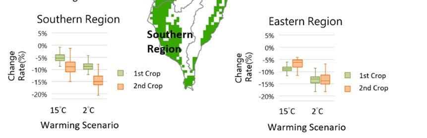 Under the future warming scenario, in agriculture, rice production in Taiwan shows a decreasing trend, and the average yield reduction of the second crop is more obvious than that of the first crop (Figure ).