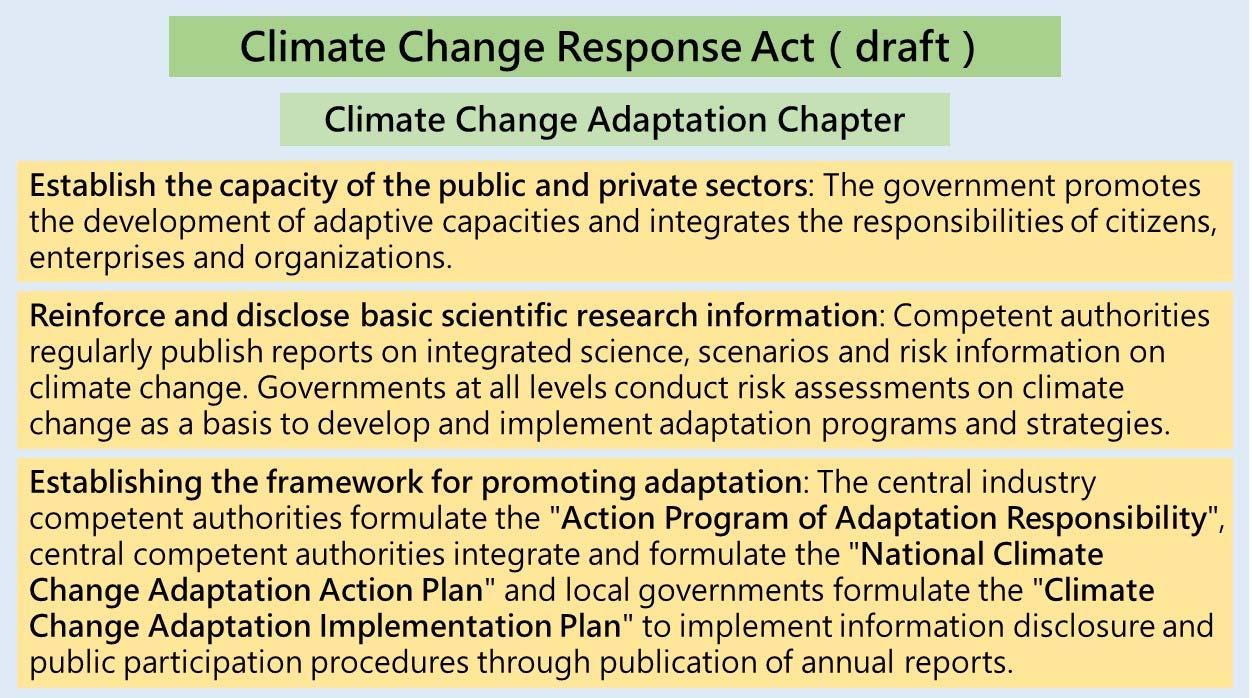 Reduction and Management Act in October , titled as Climate ChangeResponseActso as to cope with the new climate change threats. The Bill has been submitted to the Legislative Yuan for deliberation on April , . The main features on the new Bill include incorporating the net zero emission target into law, upgrading the level of climate governance, adding a special chapter on climate change adaptation, strengthening emission controls and incentive mechanism to promote carbon emission reduction, as well as and charging carbon fees for dedicated use. The main coverage of the climate change adaptation are illustrated in Figure .
