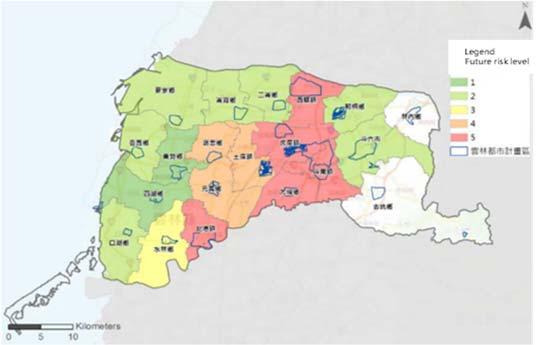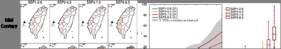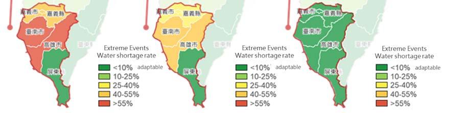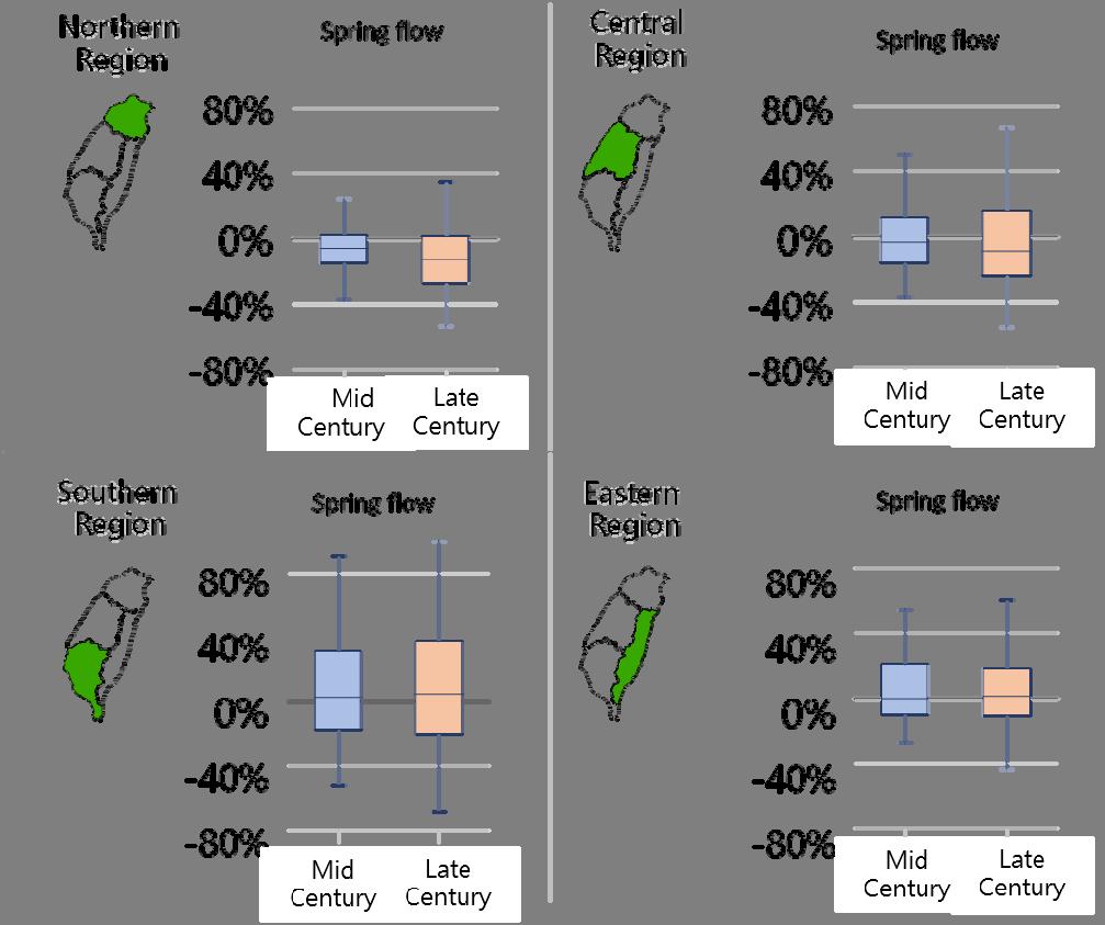 Under the future warming scenario, there will be an increase in extreme rainfall intensity, a decrease in the chance of typhoons hitting Taiwan and a change in rainfall patterns. In terms of flooding impact, all regions showed an increasing trend except for the central region, which showed a slight decrease in the middle of the century. In terms of the impact of slope failure disaster, all regions showed an increasing trend in the middle of the century, except for the central mountainous areas. This increasing trend becomes more obvious at the end of the century. In terms of water resources, the fluctuation of river flow between wet and dry seasons in catchment areas became larger, and the flow in spring generally showed a decreasing trend in the middle of the century. This change was more significant at the end of the century, which may increase the risk of drought (Figure ).