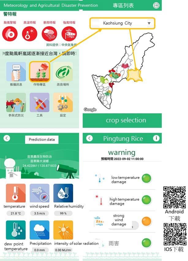 Users can browse typhoon, high temperature, rainstorm, and strong wind event warnings on the Weather & Agriculture Disaster Prevention mobile application, or search for Agricultural Research and Extension Stations, Agricultural Weather Stations, and view crop areas in specific counties and cities to get detailed weather monitoring information for each location.