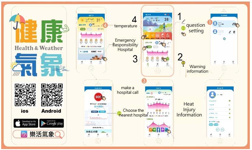 Government agencies have collaborated to build a national health weather warning platform and mobile application LOHAS WeatherHealth Service to proactively notify the public of heat (cold) injury, the early warning classification and protective measures. The Health Promotion Administration also uses various channels to carry out heat injury prevention publicity in summer and remind the public to keep warm during cold spells in winter to prevent cardiovascular and respiratory diseases deteriorated by low temperature.