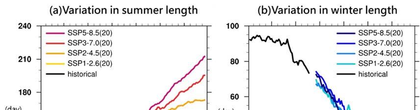 In terms of the distribution of seasons, the length of summer has increased to about - days in the early st century, while the length of winter has shortened to about days and to about - days in recent years (Figure ).