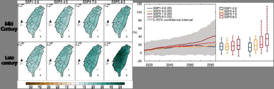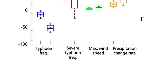 Under the worst-case scenario (RCP . ), the number of typhoons affecting Taiwan will decrease by % and % by the middle and end of the century respectively, but the severe typhoons will increase by % and %, while the typhoon rainfall change rate will increase by % and % respectively (Figure ).