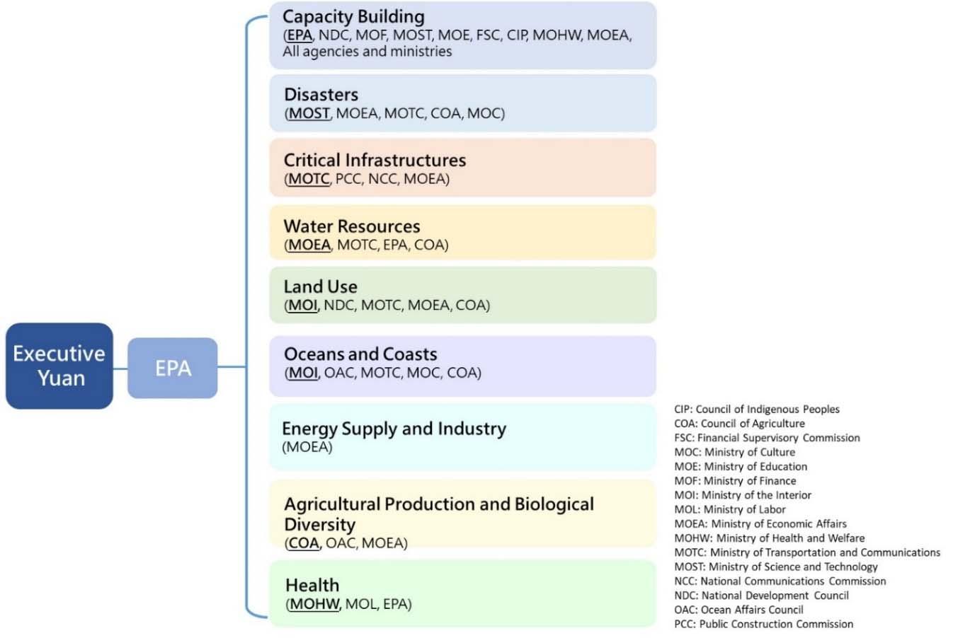 Afterwards, the Environmental Protection Administration (EPA) completed the legislation of the Greenhouse Gas Reduction and Management Act in and formulated the National Climate Change Action Guideline in . In , the EPA convened ministries including the National Development Council to jointly draft the National Climate Change Adaptation Action Plan ( - NAP), which serves as the institutional framework to implement the climate change adaptation works. The distribution of work among ministries is shown in Figure .