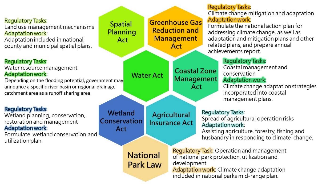 The legal framework to justify the implementation of climate change adaptation is mainly composed of the Greenhouse Gas Reduction and Management Act, Spatial Planning Act, Coastal Zone Management Act, Water Act, Wetland Conservation Act Agriculture InsuranceActandNationalParkLaw,which are highlighted in Figure .