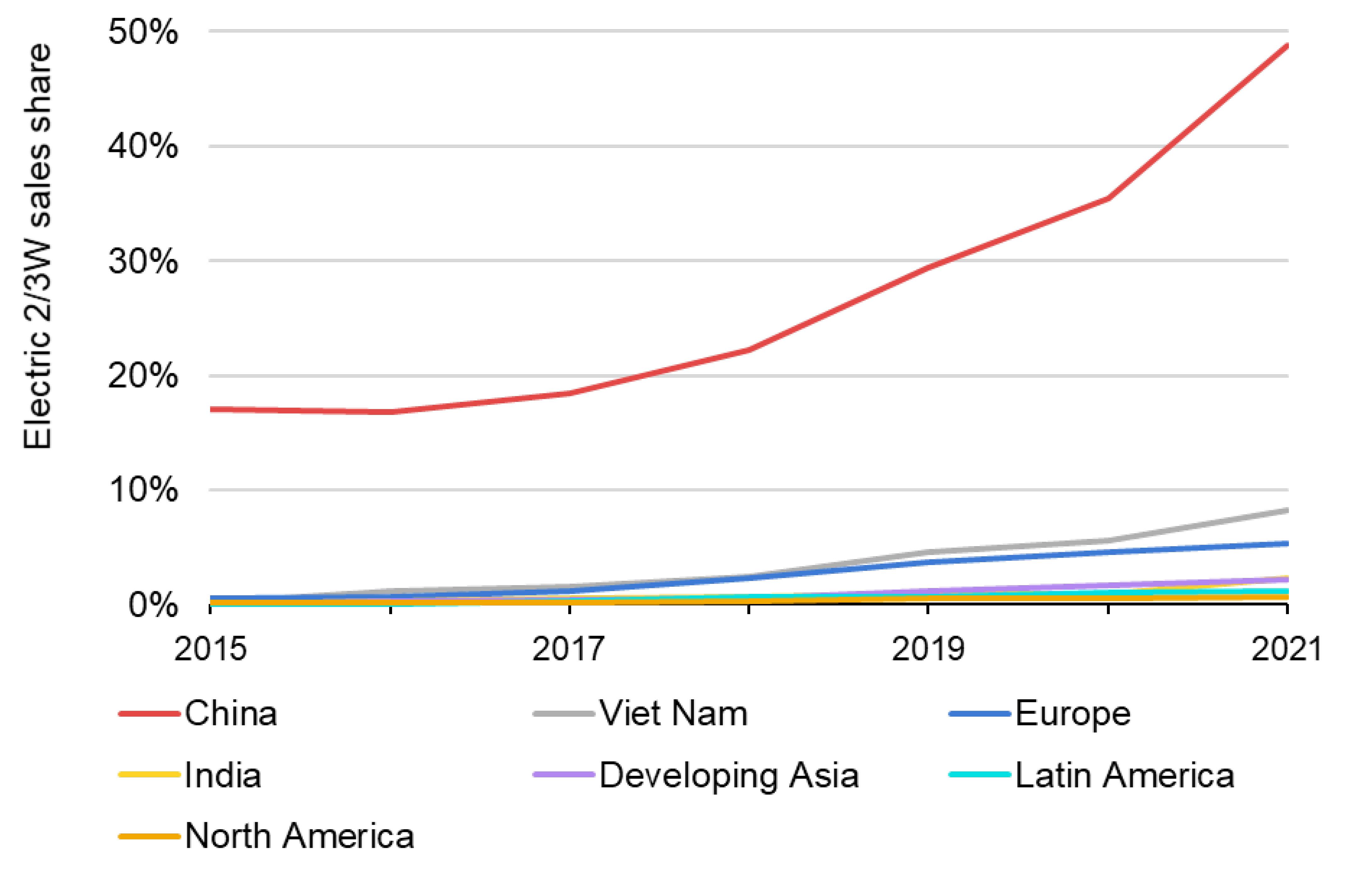In China, electric cars are typically smaller than in other markets. This, alongside lower development and manufacturing costs, has contributed to decreasing the price gap with conventional cars. In 2021, the sales-weighted median price of EVs in China was only 10% more than that of conventional offerings, compared with 45-50% on average in other major markets. China accounts for 95% of new registrations of electric two- and three-wheeler vehicles and 90% of new electric bus and truck registrations worldwide. Electric two- and three-wheeler vehicles now account for half of China’s sales. The speed of charging infrastructure roll-out in China is faster than in most other regions.