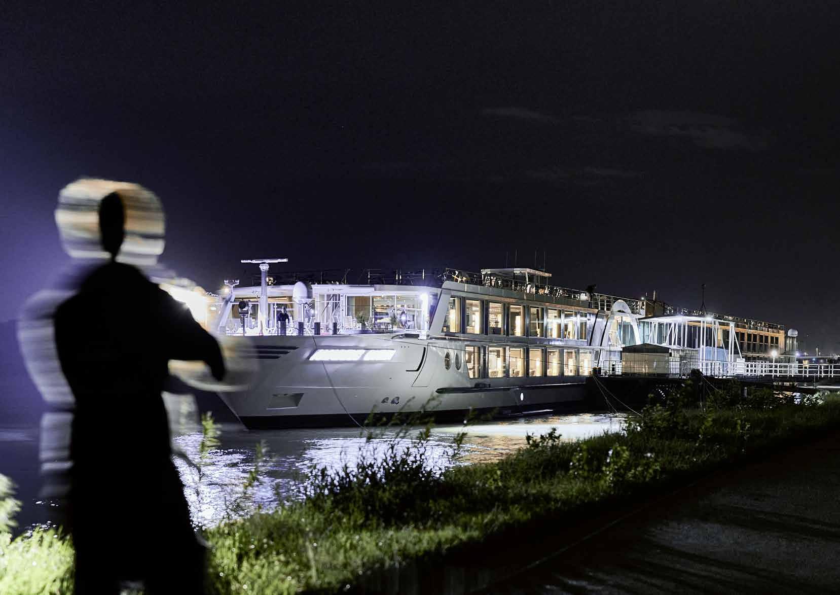 He’s right, of course! When we step outside into the cool night air a little later, the glaring lights of the Altenwörth lock are already looming into view in front of the bow. For Captain Michail Savin and his crew, this moment requires their utmost concentration, as they have to manoeuvre our 135-metre-long and almost 12-metre-wide colossus through two giant steel gates into the narrow lock chamber… as quietly as possible! After all, we don’t want to wake the guests, do we?