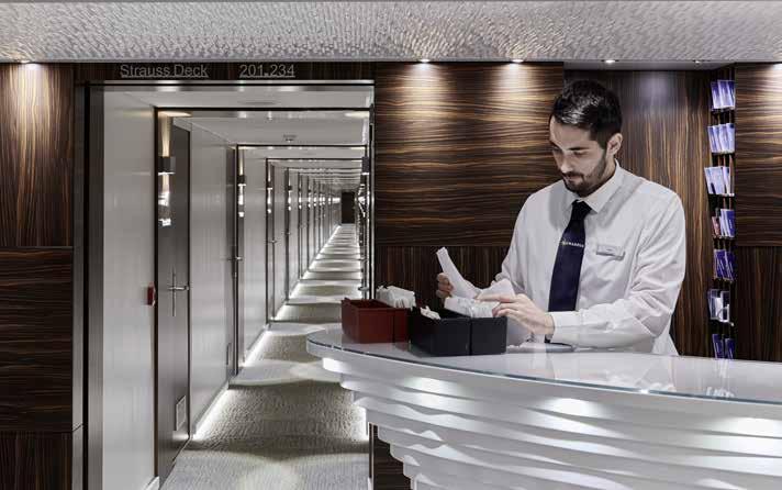 It’s not long now until the planned docking manoeuvre in Vienna, so it‘s high time to pay a visit to Vlad Rasu, who, as night receptionist, always offers his passengers a friendly ear, or, if they need it, help and advice, extra blankets or hot tea. The fact that he regularly covers around 10,000 steps on 18 floors during every single shift has nothing to do with catering for the guests’ extra needs, however. In fact, every hour on the hour he has to complete a prescribed security patrol throughout the ship. There are stations dotted around the