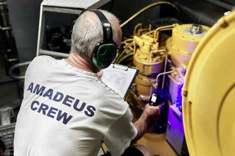 vessel, all marked with small, circular symbols. Some are hidden, behind the bow thruster, for example, some are clearly visible to those in the know, such as the ones by the indoor pool in the AMADEUS Club or in the gym. Nevertheless, all must be scanned along the way. This is essential for safety on board. “It’s also great for my physical fitness,” Vlad explains with a twinkle in his eye, as we join him on his last patrol of the night.