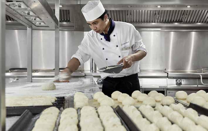 The galley is easy to find at this time of night, you simply have to follow your nose! A few short hours ago, the grand gala dinner was conjured up in this small space. Now, the ovens are running hot again. Starting at 1am, around 20 loaves of fresh bread and 300 rolls for breakfast are baked. A total of 8 different varieties are prepared, but they all have the same tempting aroma. We get the chance to speak to baker Putu, a cheerful and friendly Balinese man, as he places each skilfully hand-shaped pastry piece, all the same size and the same distance from