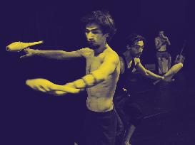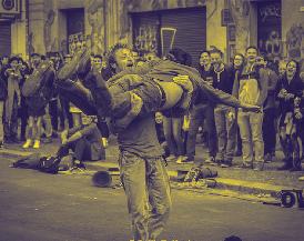 Acrobatic dance and circus techniques, bodies in continuous displacement. The performers move in an empty space, giving the impression of being in a state of constant imbalance, suspended between dream and reality, in a whirlwind of ideas, words, sound and movement, unstoppable.