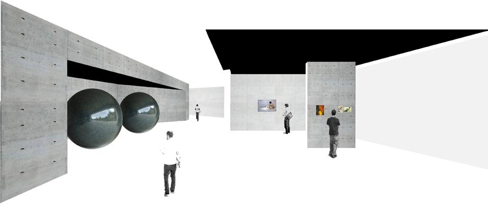 en el centro de arte se exponen obras relacionadas con la trascendencia, la introspección y la reflexión. el recorrido empieza con la “plaza” en la cual pisamos Shalekhet - Fallen Leaves (1) (Menashe Kadishman, 1997), que da a tres salas enterradas con tres cuadros respectivamente sobre la condición humana y la vida después de la muerte : La romería de San Isidro (2) (Goya, 1819) , Visión del Apocalipsis (3) (El Greco, 1608) y El Jardín de las Delicias (4) (El Bosco, 1490) Continuando por la grieta, se encuentra la primera de las tres salas que se abren a norte, en esta las obras son relativas al retrato y expresión del sentimiento : Después del baño (5) (Sorolla, 1892) Mujer sentada con rodillas dobladas (6) y Mujer con medias verdes (7) (Egon Schiele, 1917), Autorretrato en el infierno (8) (Munch, 1903) y Trigal con cuervos (9) (Van Gogh, 1890). Las siguientes salas se exponen los cuadros más abstractos ; desde Les Nymphéas: Reflets verts (10), Matin (11) y Soleil couchant (12) (Monet, 1927), pasando por los cuadros de la Capilla Houston (13) de Rothko y terminando con Cuadrado negro sobre fondo blanco (14) y Blanco sobre blanco (15) (Málevich, 1915, 1918). Entre este recorrido también se encuentran las otras dos obras exteriores Seen/Unseen/Unknown (16) (Walter de Maria, 2009) y Tall Figure II, Tall Figure III (17) (Giacometti, 1948, 1960).