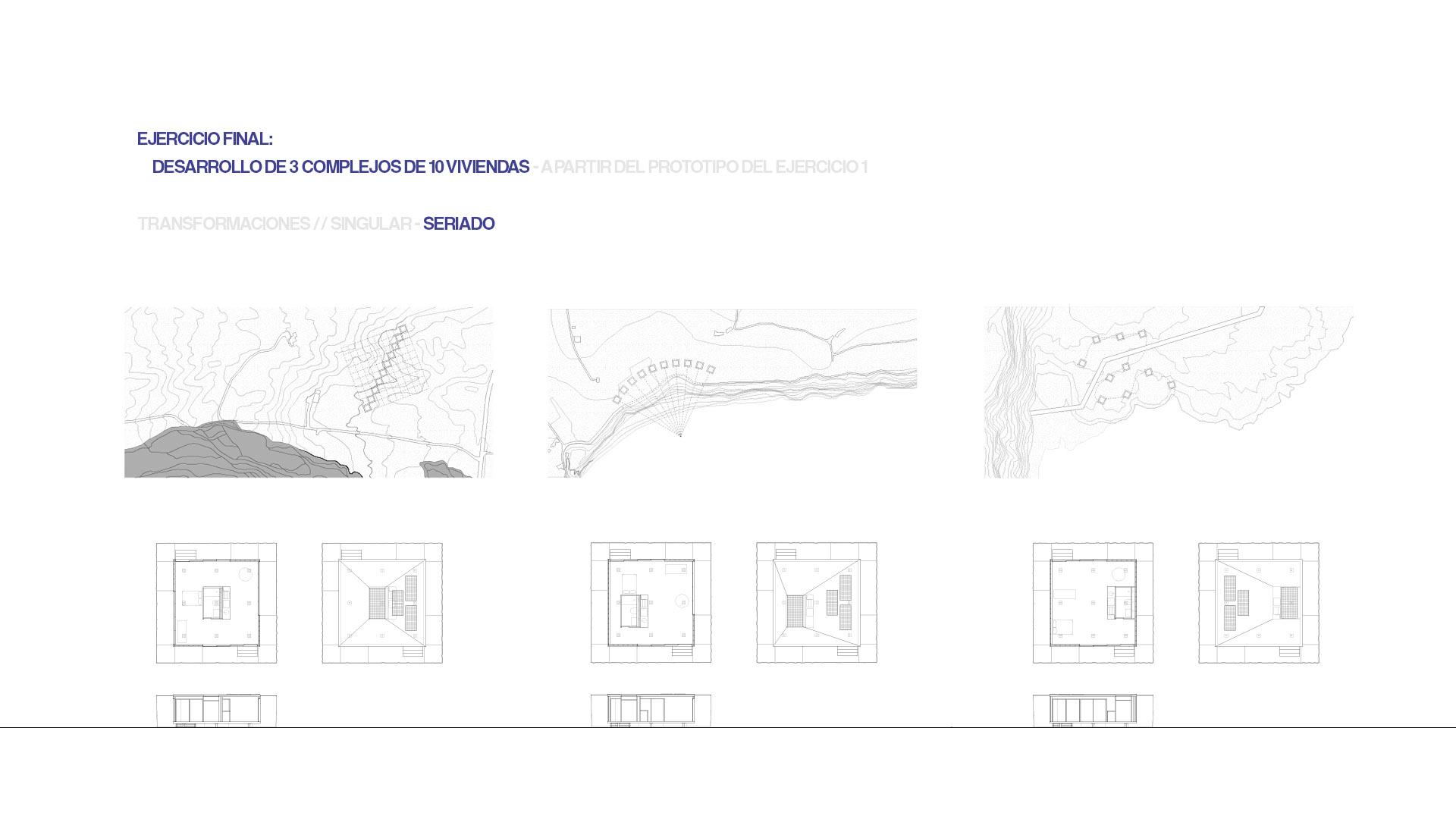 En el proyecto final de curso se desarrolla la cabaña del primer ejercicio hacia un conjunto de 10 viviendas como respuesta a una necesidad donde se ponen en valor la rapidez y la industrialización de la construcción, creando un proceso proyectual desde lo singular a lo seriado.